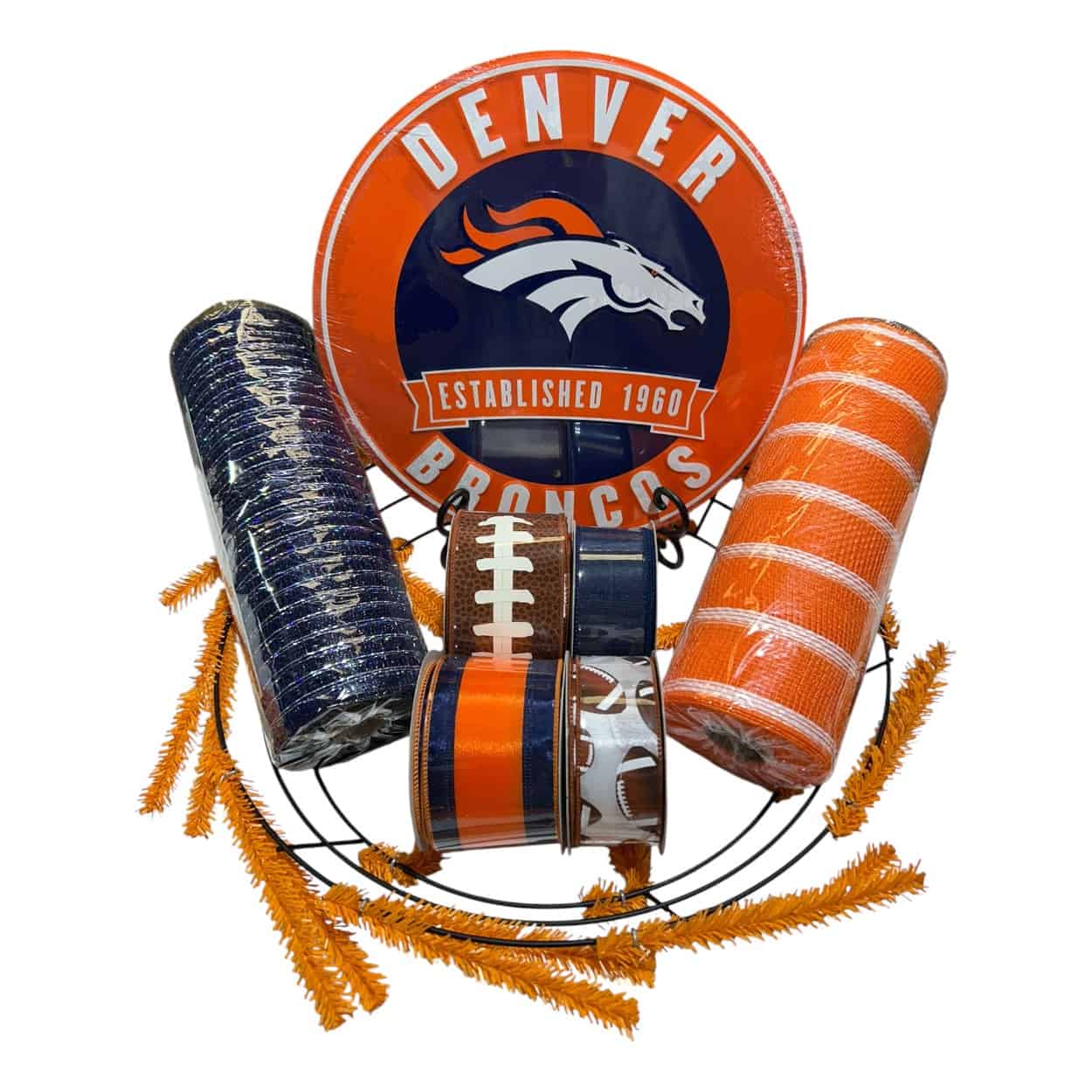 Show your team spirit with our Denver Broncos Wreath Kit. This coordinated wreath kit includes matching ribbon, deco mesh, a wire wreath frame, and a Denver Broncos sign to help you create a bold 24″ team-themed wreath without the guesswork. The bundle contents are fixed and pre-packed for convenience, value, and faster shipping.