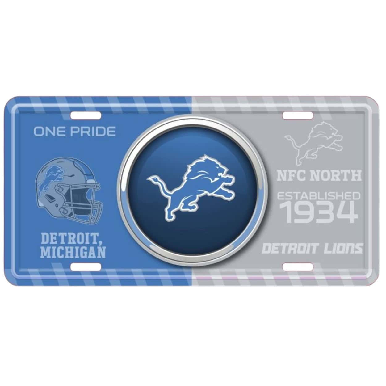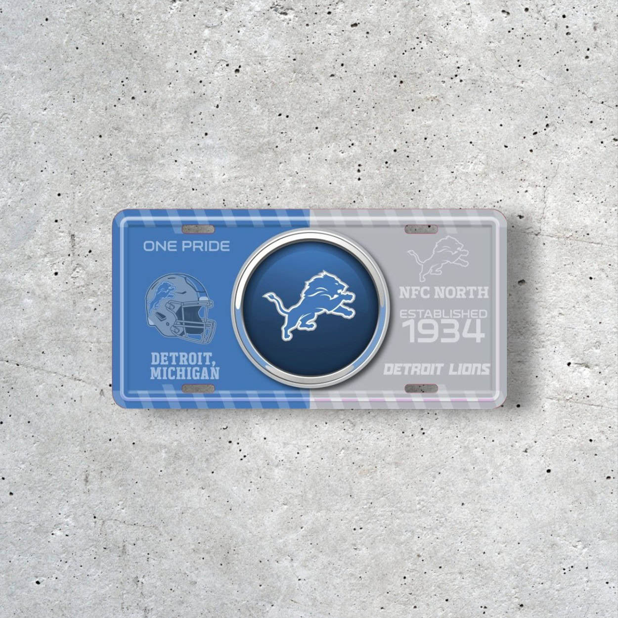 Our Detroit Lions Bullseye License Plate is perfect for your football wreaths, home decor, vehicles and gifts! The sign features the colors and logo of the NFL Detroit Lions. The license plate measures 12″ wide x 6.75″ tall and is made of weather resistant embossed aluminum. It includes 4 pre-drilled holes for easy mounting. This sign is made in the USA and is an officially licensed product. This license plate makes a great gift for that Lions fan!