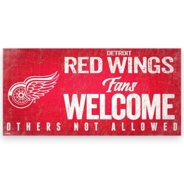 Show your spirit with this officially licensed NHL Detroit Red Wings Fans Welcome Sign! Our sign is decorated with the team name, logo, colors and text “Fans Welcome, Others Not Allowed”. It is a distressed design to mimic the look of rustic wood. The image is printed directly on the sign base, made of MDF wood – this is not a printed paper decal. This sign is made in the USA and measures 12″ x 6″ x .25″ and includes an attached rope hanger. The Detroit Red Wings Fans Welcome Sign can be used as a wreath accent sign, home decor, mancave or a gift for that special fan.