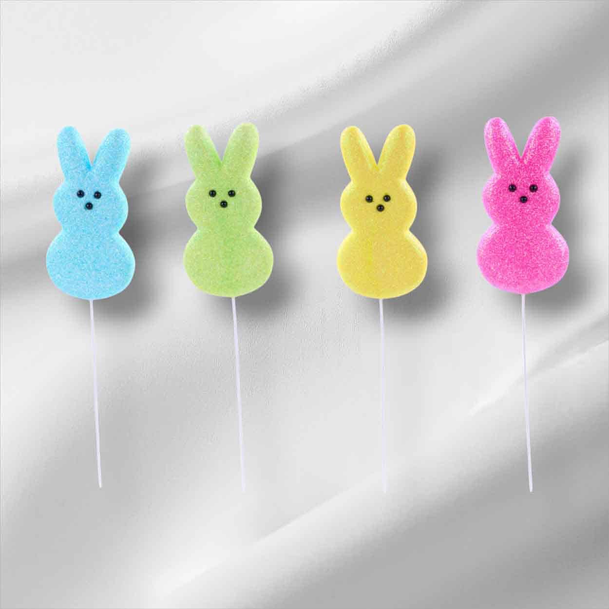 Add bright pastel color to your spring projects with these Easter Peep Picks—perfect for Easter wreaths, floral arrangements, party décor, and crafts. This set includes four peeps in pastel blue, green, yellow, and pink on an 11.75″ white wired stem, making them easy to shape and secure in your designs. Made from glitter-covered foam, these Easter Peep Picks are a fun finishing touch for Easter decorating.