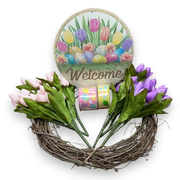 Decorate with our Easter Tulips Wreath Kit! This 10-piece kit includes everything you need to make a beautiful 18″ Easter wreath! The kit includes our 12″ Welcome Easter Sign, 2.5″ Pink Easter Egg Ribbon, 1.5″ Yellow Easter Egg Ribbon, 3 – Pink Tulip Picks, 3 Lavender Tulip Picks, and an 18″ Grapevine Wreath Form. This curated bundle ensures your items will match perfectly and takes the guess work out of desigining your wreath. The bundle contents are fixed and pre-packed for lower prices and faster shipping. Use this kit “as-is” or as a base to futher customize. We hope you enjoy this Easter Tulips Wreath Kit as much as we do!