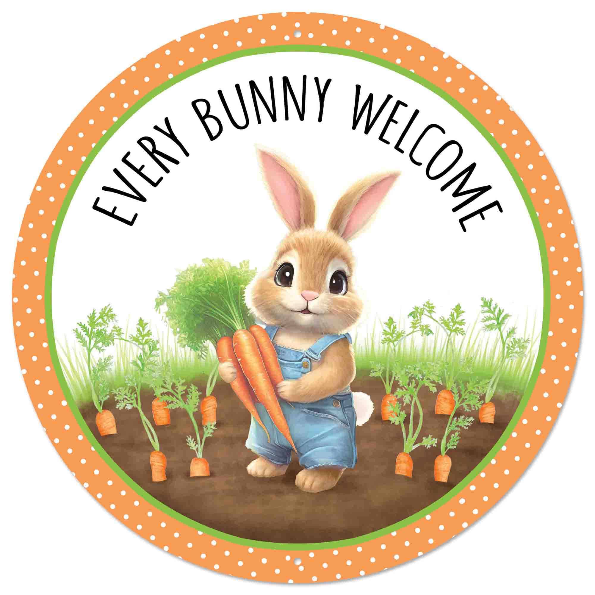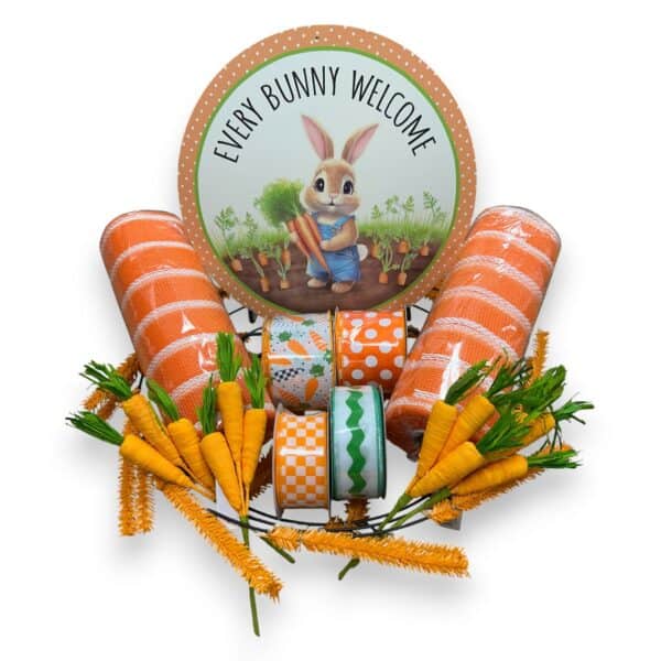 Celebrate the holiday with our Every Bunny Welcome Easter Wreath Kit! This 12-piece kit includes everything you need to make a beautiful 24″ Easter wreath! The kit includes our Welcome Bunny Sign, 2.5″ White Carrot Ribbon, 2.5″ Orange and White Polka Dot Ribbon, 1.5″ Orange White Check Ribbon, 1.5″ Lime Green Ric Rac Ribbon, 4-Carrot Picks, 2 rolls 10″ Orange White Deco Mesh, and a 15″ Orange Wire Wreath Frame.  This curated bundle ensures your items will match perfectly and takes the guess work out of desigining your wreath. The bundle contents are fixed and pre-packed for lower prices and faster shipping. We hope you enjoy this Every Bunny Welcome Easter Wreath Kit as much as we do!