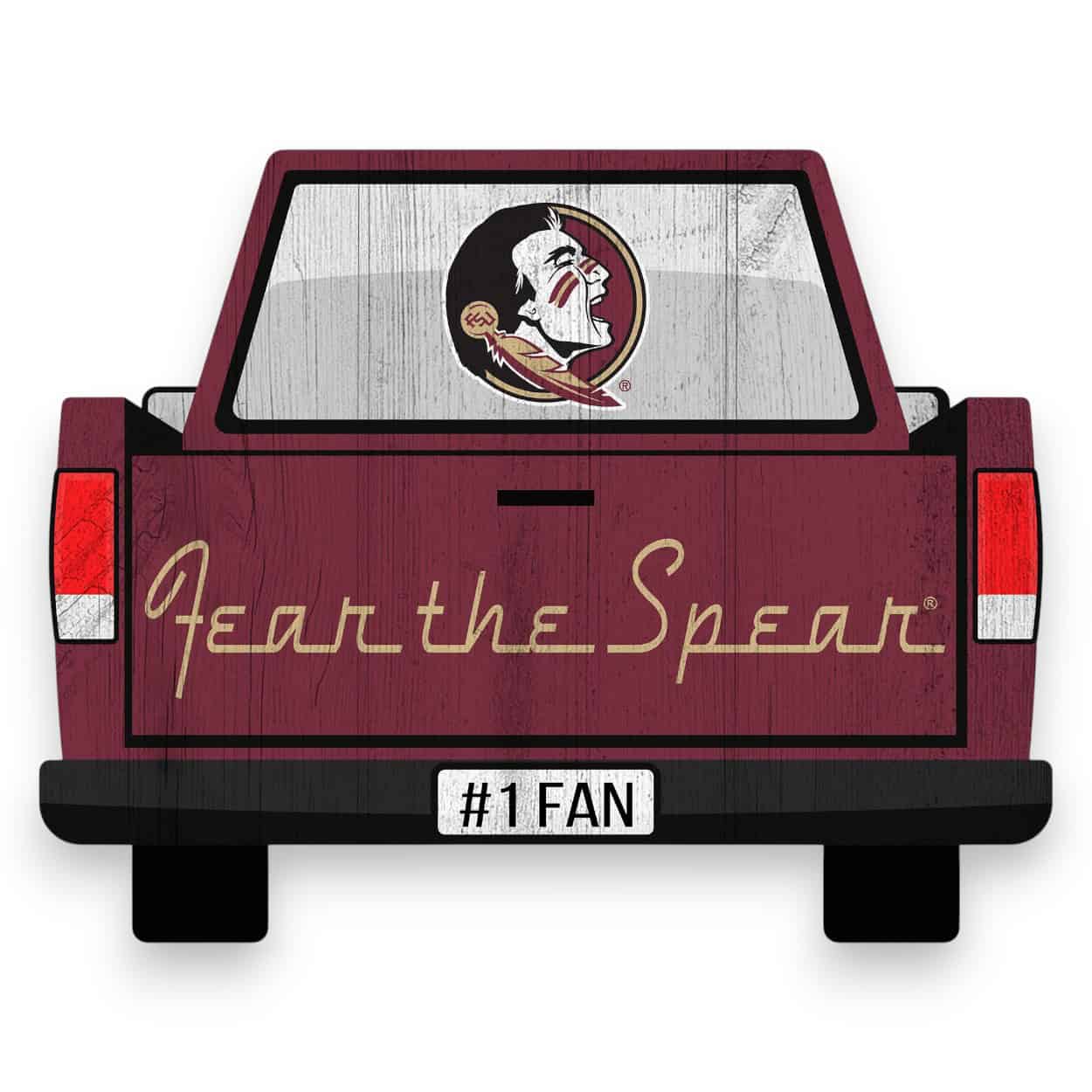 Show your spirit with this officially licensed NCAA Florida State Tailgate Sign! Our Florida State Tailgate Sign is decorated to look like the back end of a sporty pickup truck. The back window is decorated with the school logo, the tailgate with the school text and the license plate with #1 Fan. This is a distressed design to mimic the look of rustic wood and measures 12″ x 9.5″ x .25″. The sign base is MDF wood and made in the USA. The design is printed directly onto the wood (this is not an adhesive sticker) and includes a sawtooth hanger. Perfect as a wreath accent sign, sports craft supply, home decor, or a gift for that special football fan.