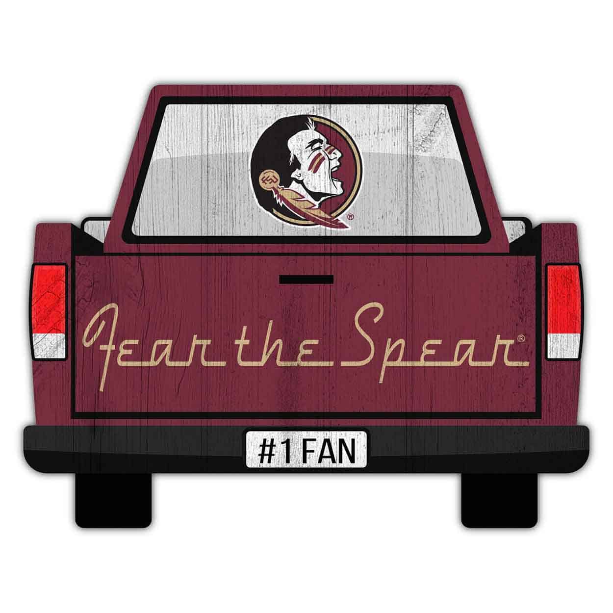 Show your spirit with this officially licensed NCAA Florida State Tailgate Sign! Our Florida State Tailgate Sign is decorated to look like the back end of a sporty pickup truck. The back window is decorated with the school logo, the tailgate with the school text and the license plate with #1 Fan. This is a distressed design to mimic the look of rustic wood and measures 12″ x 9.5″ x .25″. The sign base is MDF wood and made in the USA. The design is printed directly onto the wood (this is not an adhesive sticker) and includes a sawtooth hanger. Perfect as a wreath accent sign, sports craft supply, home decor, or a gift for that special football fan.FAQs