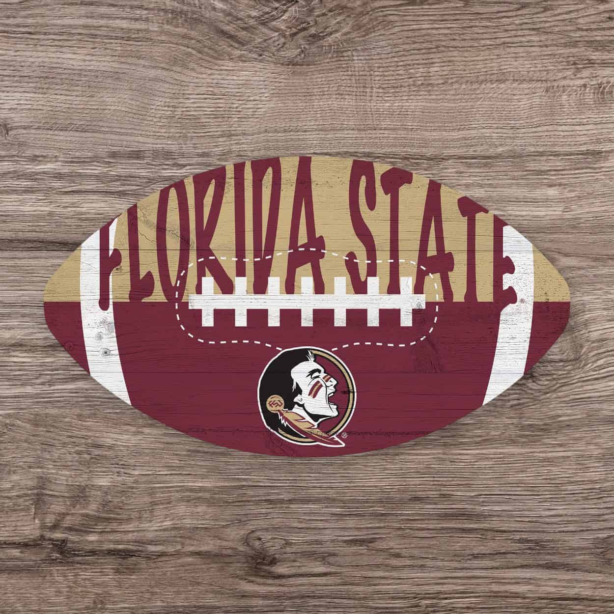 Celebrate game day with this officially licensed NCAA Florida State Color Football Sign, featuring a football design in the Florida State University logo and team colors. The rustic distressed finish gives it a weathered wood look, and the image is printed directly on durable MDF. Made in the USA, this Florida State Color Football Sign measures 12″ x 7″ x 0.25″. Use it as a wreath accent sign, front door or wall decor, tailgate decor, or a fun gift for any Seminoles fan.
