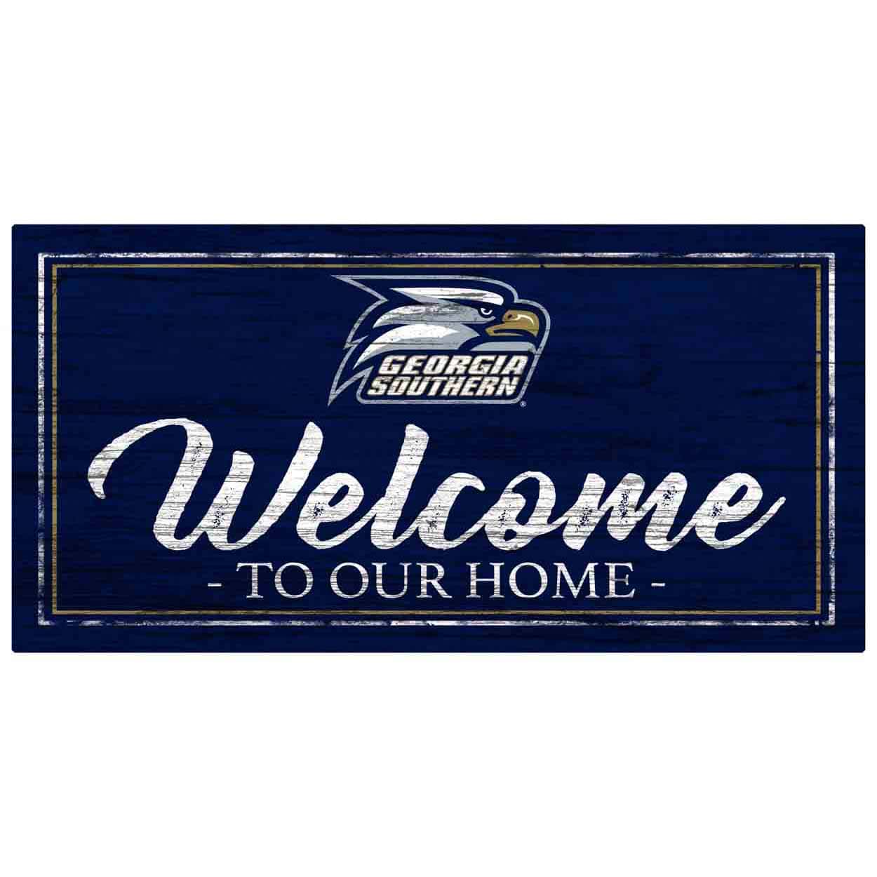 Show your spirit with this officially licensed NCAA Georgia Southern Home Sign! Our sign is decorated with the school colors and logo, along with the text “Welcome to our Home”. It is a distressed design to mimic the look of rustic wood. The sign image is printed directly onto MDF wood and includes an attached hanger. This Georgia Southern Home Sign is made in the USA and measures 12″ x 6″ x .25″. The welcome sign can be used as a wreath accent sign, home decor or a gift for that special fan.FAQs