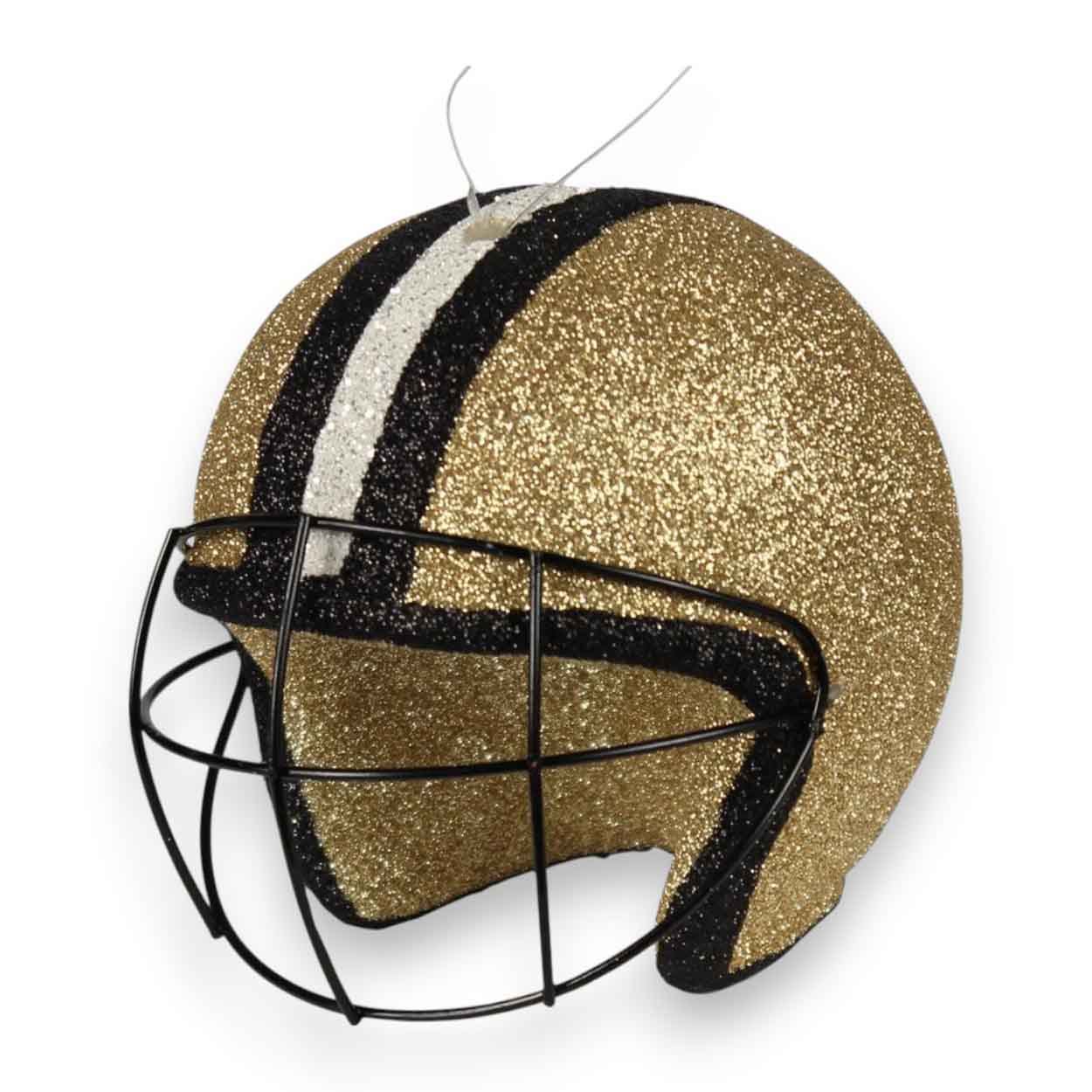 Our Gold Black 3D Football Helmet Ornament features a gold, black and white colored helmet with an attached clear plastic loop for hanging. The 3D football helmet measures 4″ diameter and is made of plastic covered in glitter. Just perfect for a New Orleans Saints wreath, craft project, party decorations, tree trimming and gifts!FAQs