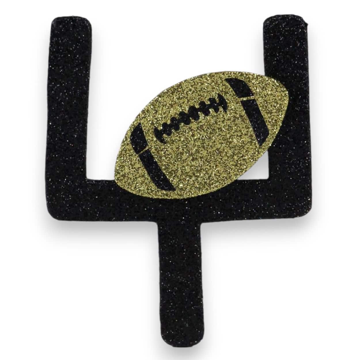 Our Gold Football Wreath Attachment is wonderful for all sorts of crafts, especially wreath making! The football is made of foam and is covered in gold and black glitter. The goal post is also made of foam and is covered in black glitter. The attachment measures 5″ high by 4″ long. It’s perfect for football wreaths, craft projects, party favors, your Christmas tree, gift tags or as a gift for that special football fan.Â
