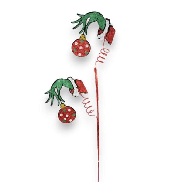 Our Green Monster Hand Pick features 2 felt Green Monster hands holding an ornament on a red wired stem. The red stem is coated with glitter and measures 25″ tall. The hand with ornament measures 4.5″ wide x 5.5″ tall. Just perfect for your Christmas weaths, floral projects and party decorations. Â
