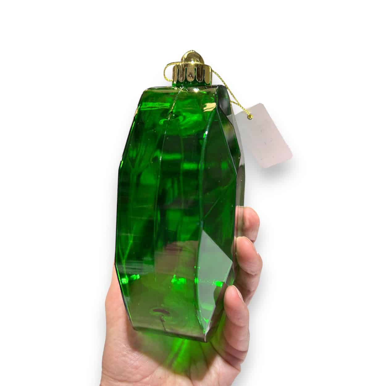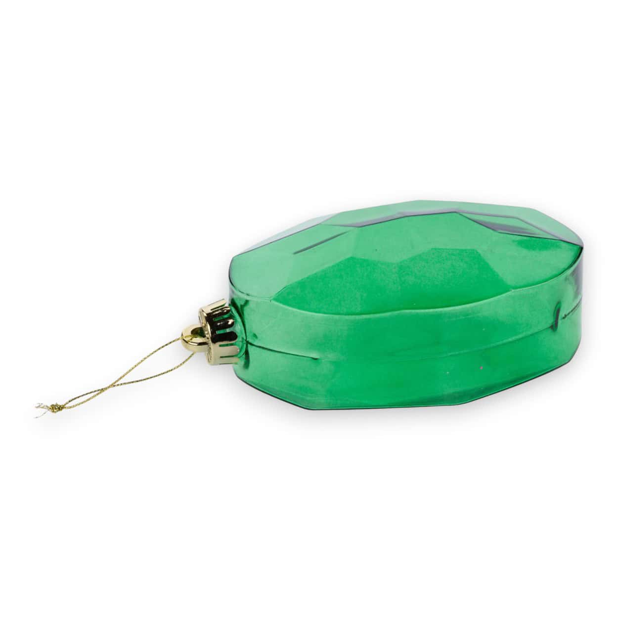 Our Green Oval Gem Ornament is beautiful! The oval shaped ornament measures 6.5″ tall x 4.25″ wide x 2″ deep. It is made of plastic and includes an attached gold loop for easy hanging. The ornament is perfect for adding a little bling to your wreaths, craft projects, Christmas trees and more!