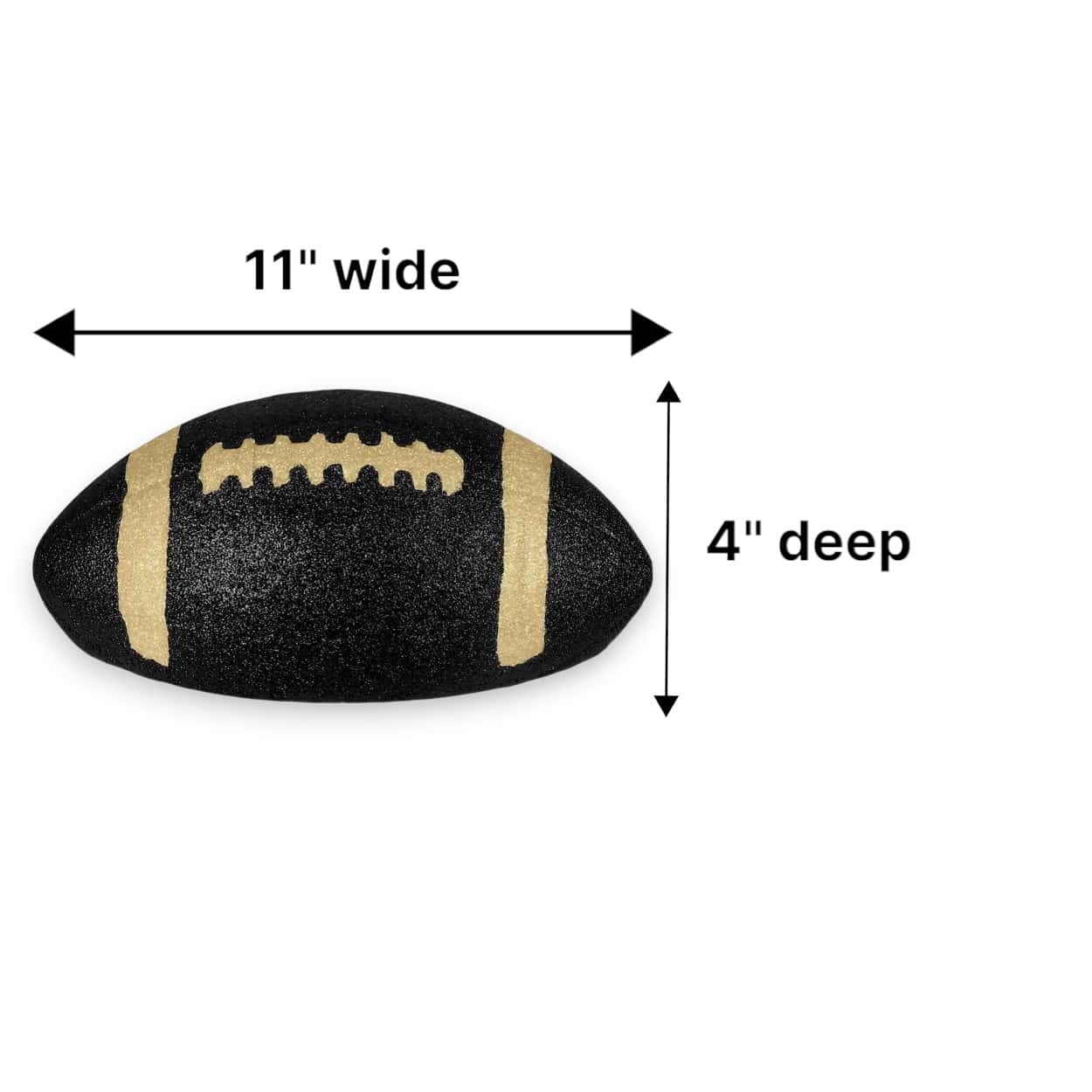 Cheer on your team with our Half Gold Black Football! This half-football is flat on the back-side, making is perfect as a wreath center, tailgate centerpiece, floral arrangement, home decor amd more. The football is made of styrofoam and measures 11″ wide x 4″ deep.