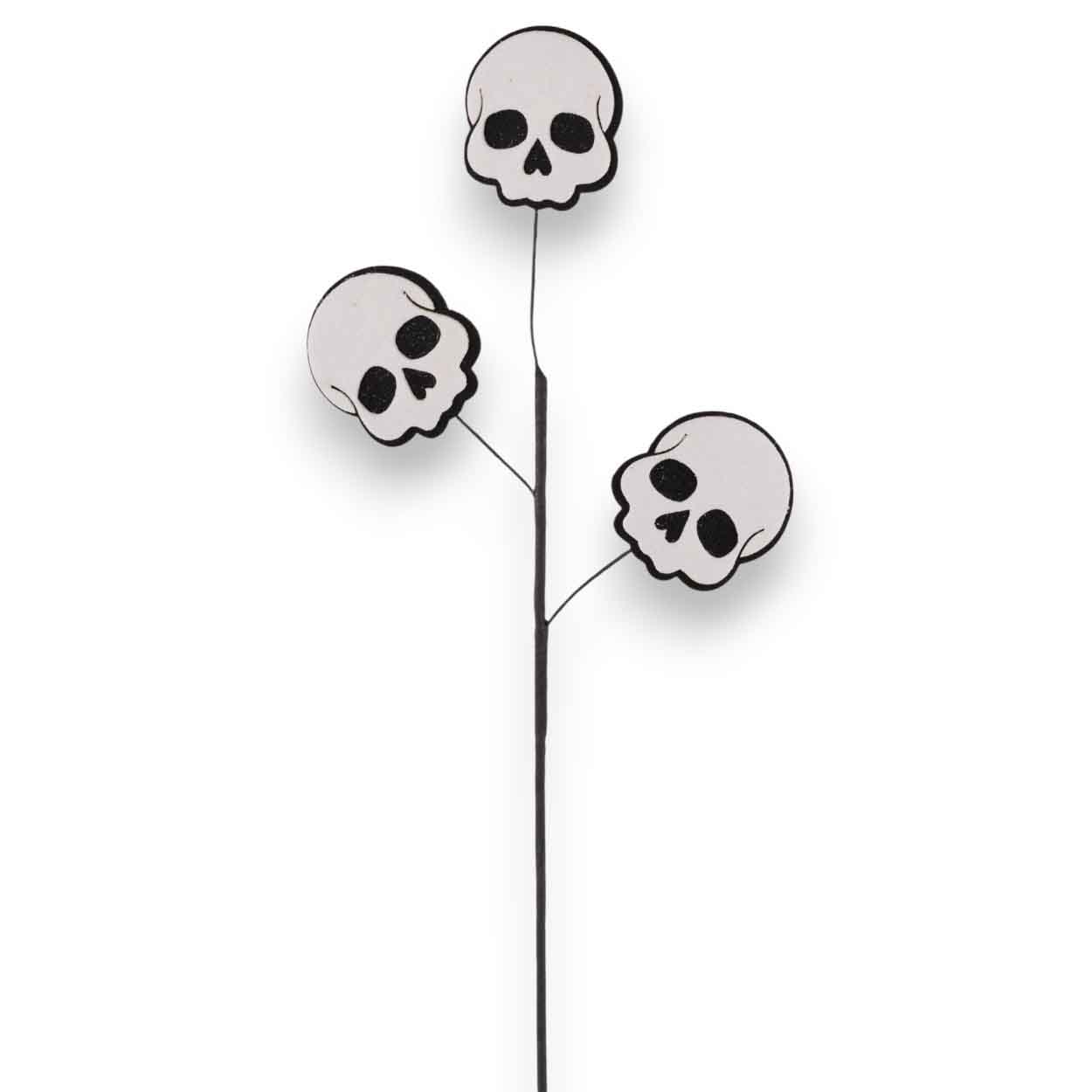 Add spooky sparkle with Skull Halloween Spray—a 22 inch pick featuring three glitter-covered felt skulls on a black wired stem. The wired stem makes it easy to bend, shape, and tuck into wreaths, centerpieces, and arrangements. Use Skull Halloween Spray for Halloween wreath accents, decorations, and seasonal craft projects.