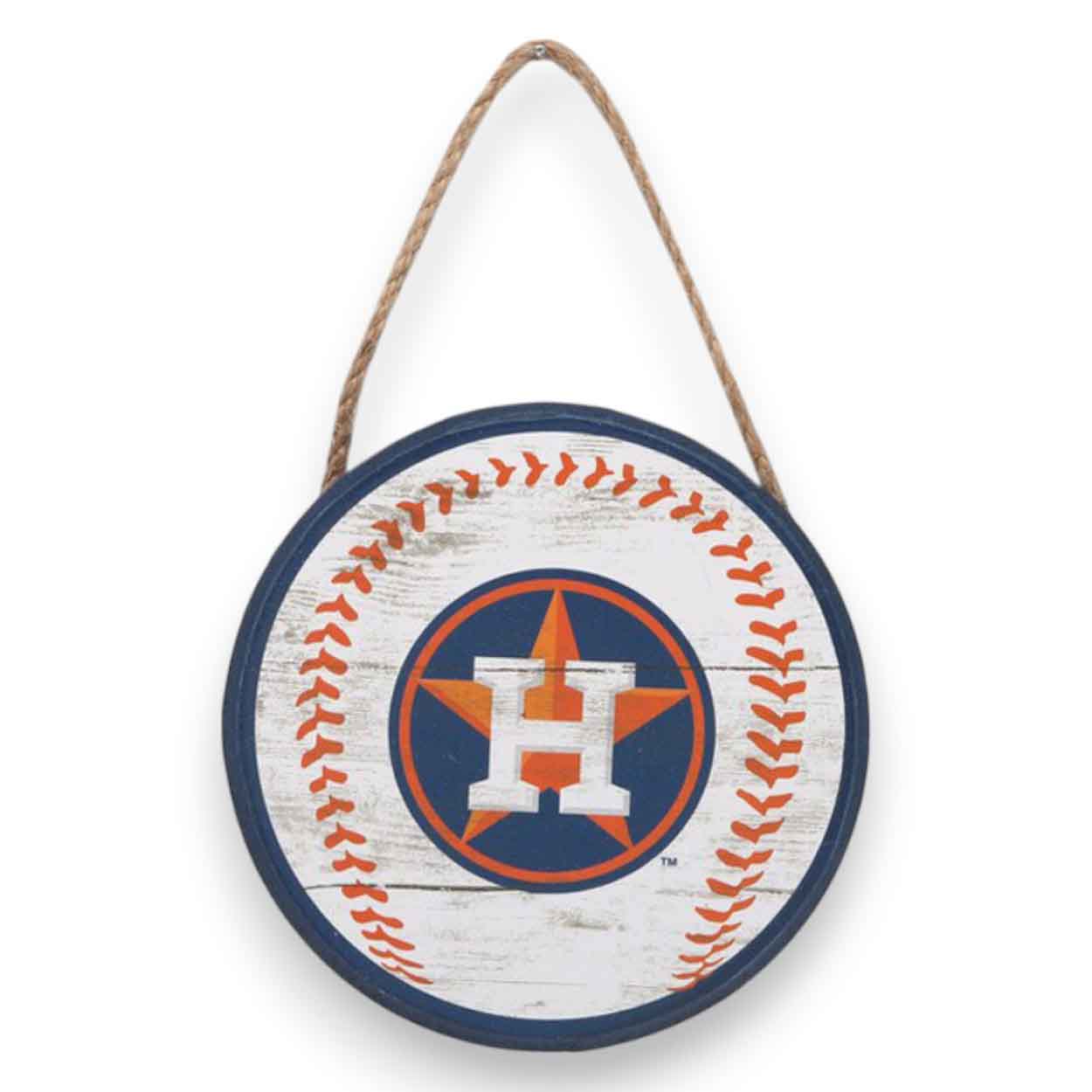Cheer on your team with our Houston Astros Ornament! This officially licensed MLB ornament features the team logo and colors in a distressed design. The Christmas ornament measures 4″ W X 4″ H X 0.375″ D and is made in the USA. It is made of wood and features an attached twine hanger. The design shown in on the front of the ornament, while the back of the ornament is plain wood. This Houston Astros Baseball Ornament is perfect for wreaths, Christmas trees, home decor and gifts for that special MLB Astros fan.FAQs