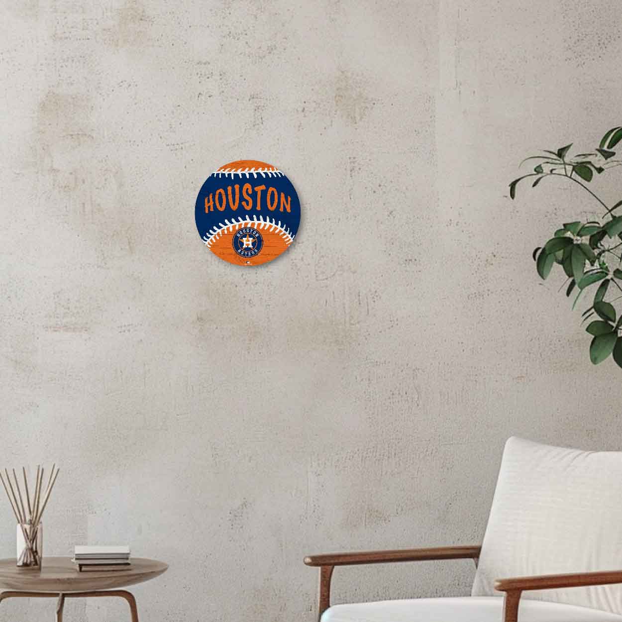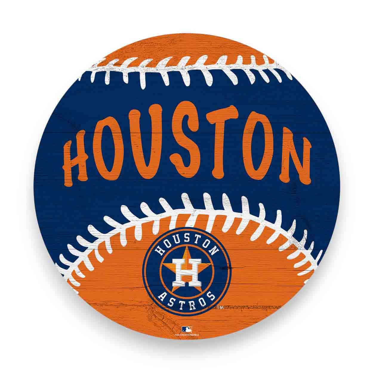 Our Houston Astros Baseball Sign features a baseball decorated with the team colors, name and logo. This officially licensed MLB Houston Astros Baseball Sign measures 12″ diameter and is .25 inches thick. This is a distressed design and the images are printed directly onto MDF wood. The sign is made in the USA and includes an attached saw-tooth hanger. The sign can be used as a wreath sign, home decor, party decor or a gift for that special baseball fan.FAQs