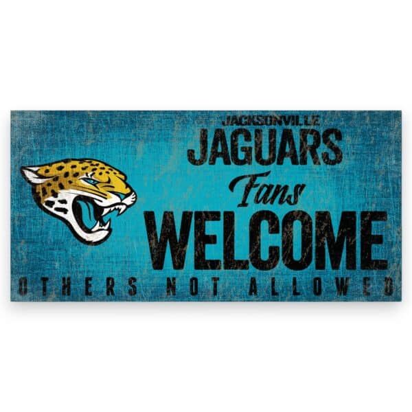 Show your spirit with this officially licensed NFL Jacksonville Jaguars Fans Welcome Sign! This sign is perfect as a wreath accent, a front door decor piece, man cave decoration, or a fan gift. It has a rustic distressed wood look and features the text “Fans Welcome, Others Not Allowed”, printed directly on MDF. Made in the USA, it measures 12″ long x 6″ high and includes an attached twine hanger.