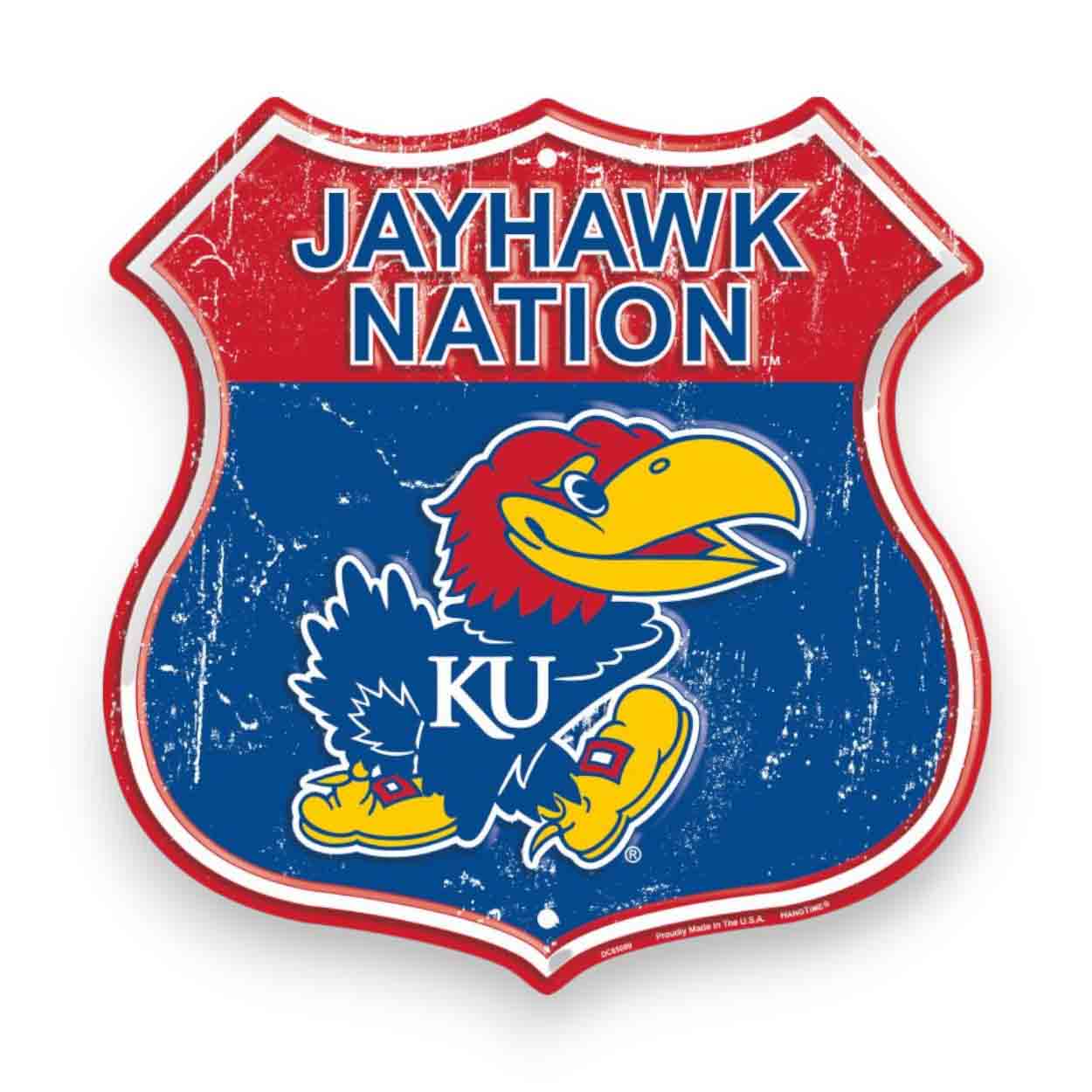 Show your spirit with our Kansas Jayhawks Shield Sign! This officially licensed NCAA Kansas Jayhawks Shield Sign features the team colors and logo on a shaped sign. The image is a distressed design. The lightweight weather resistant embossed aluminum sign measures 12 inches wide x 12 inches tall. It includes predrilled holes at 6 and 12 o’clock for easy mounting. This collegiate sign is made in the USA and perfect for wreaths, home decor, party decor and fan gifts!FAQs