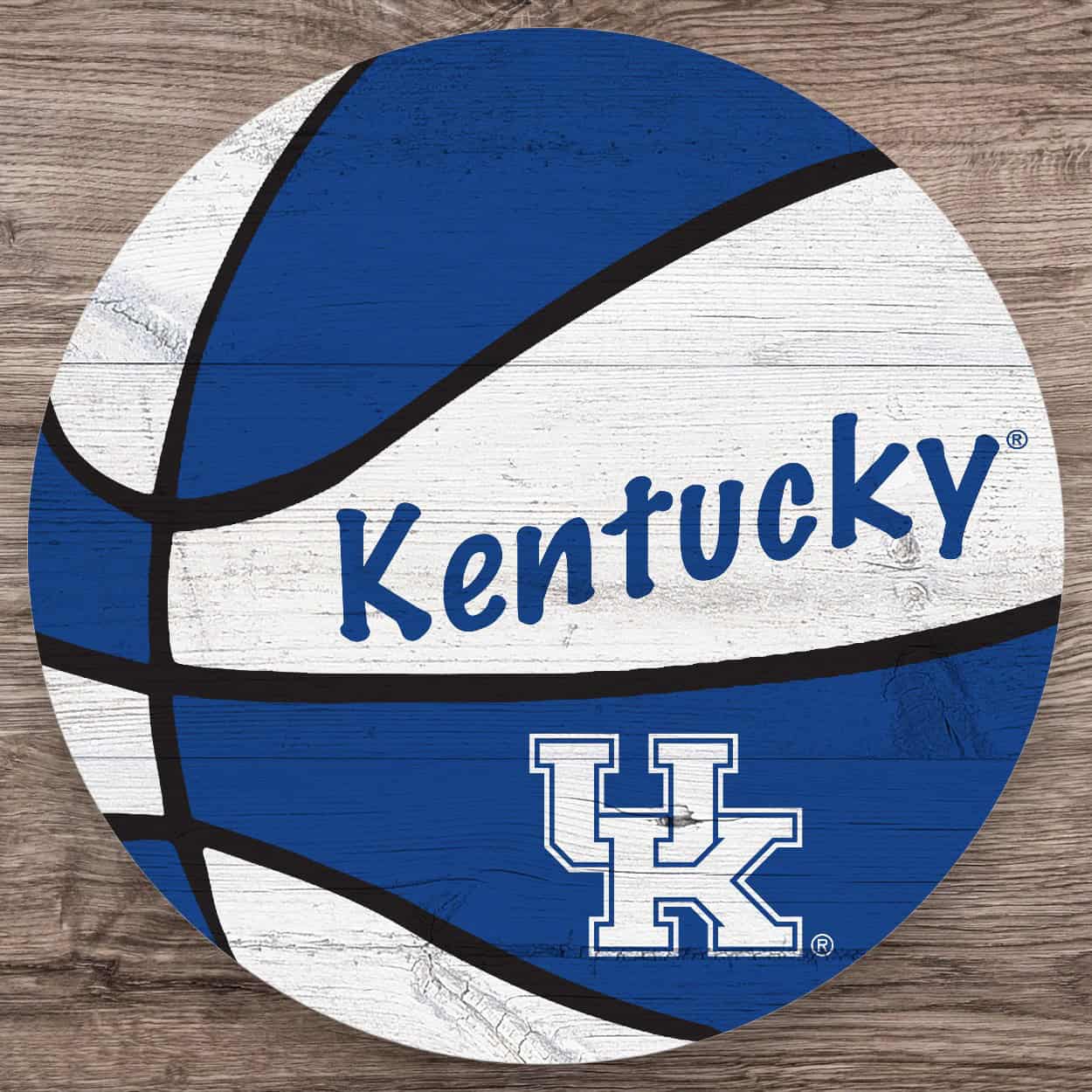 Our Kentucky Wildcats Sign features a basketball representing the logo and colors of the University of Kentucky. This officially licensed NCAA Kentucky Sign has the distressed design printed directly on MDF wood. The sign measures 12″ diameter and is .25 inches thick. Just perfect for a UK wreath or gift for a UK basketball fan.