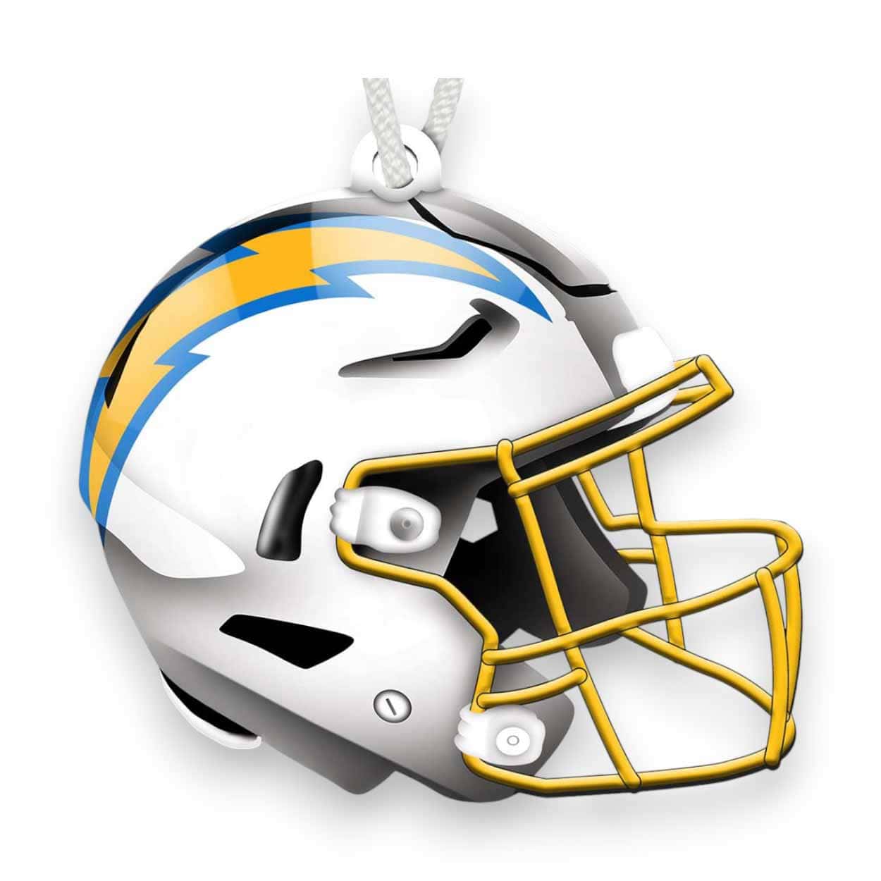 Show your spirit with this officially licensed NFL LA Chargers Flat Helmet Ornament! The football ornament is in the shape of a helmet and decorated with the team logo and colors. This is a distressed design to mimic the look of rustic wood. The design is printed directly on MDF wood on the front side only, while the back side is bare wood. There is a small hole at the top for hanging. This LA Chargers Flat Helmet Ornament is made in the USA and measures 4″ x 4″ x .25″. Just perfect as a wreath accent sign, sports craft supply, gift tag, tree ornament or a gift for that special football fan.FAQs
