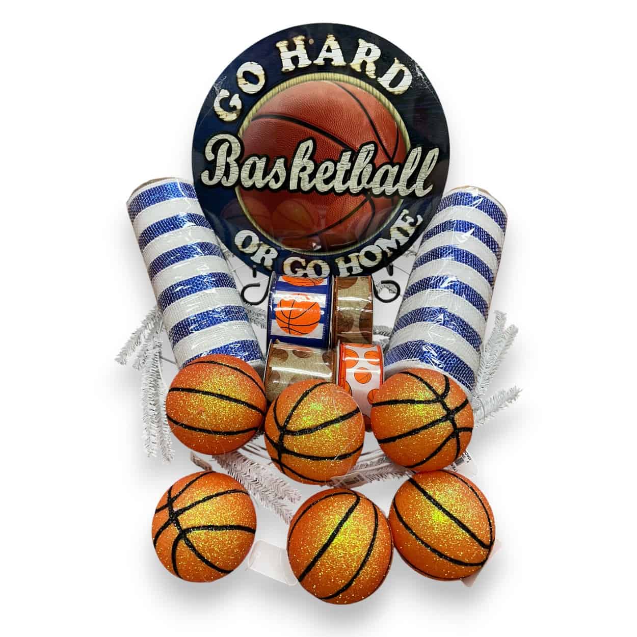Decorate with our Large Basketball Wreath Kit! This 14-piece kit includes everything you need to make a beautiful 24″ Basketball wreath! The kit includes our 12″ Basketball Sign, 2.5″ Blue White Stripe Basketball Ribbon, 1.5″ White Basketball Ribbon, 1.5″ Vintage Basketball Ribbon, 2.5″ Vintage Basketball Ribbon, 6 – Glitter Basketball Ornaments, 2 rolls 10″ Blue White Stripe Deco Mesh, and a 15″ White Wire Wreath Frame.  This curated bundle ensures your items will match perfectly and takes the guess work out of desigining your wreath. Use this wreath kit “as is” or as a base to accessorize. The bundle contents are fixed and pre-packed for lower prices and faster shipping. We hope you enjoy this Basketball wreath kit as much as we do!