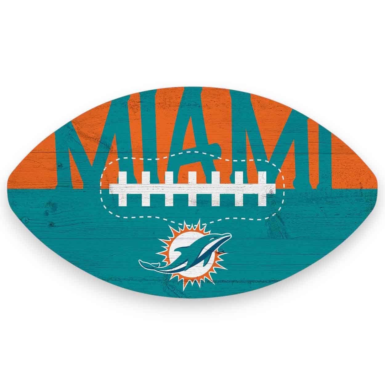 Our Miami Dolphins Color Football Sign features a football decorated in the team logo and colors. This officially licensed NFL Miami Dolphins Color Football Sign is a distressed design printed directly on MDF wood. The football sign is made in the USA, measures 12″ x 7″ x .25″ and includes an attached hanger. This sign is perfect for a wreath, home decor, party decor or a gift for that special football fan.FAQs