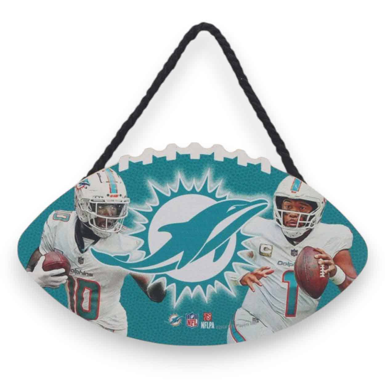 Cheer on your team with our Miami Dolphins Players Ornament! This officially licensed NFL ornament features the team logo, colors and two of your favorite players. The ornament is also officially licensed by the NFLPA. The Christmas ornament measures 5.625″ W X 3.75″ H X 0.25″ D and is made in the USA. It is made of wood and features an attached black hanger. The ornament is in the shape of a football and is die cut at the top laces. The design shown in on the front of the ornament, while the sides and back are plain wood. This Miami Dolphins Players Ornament is perfect for wreaths, Christmas trees, home decor and gifts for that special NFL Dolphins football fan.FAQs