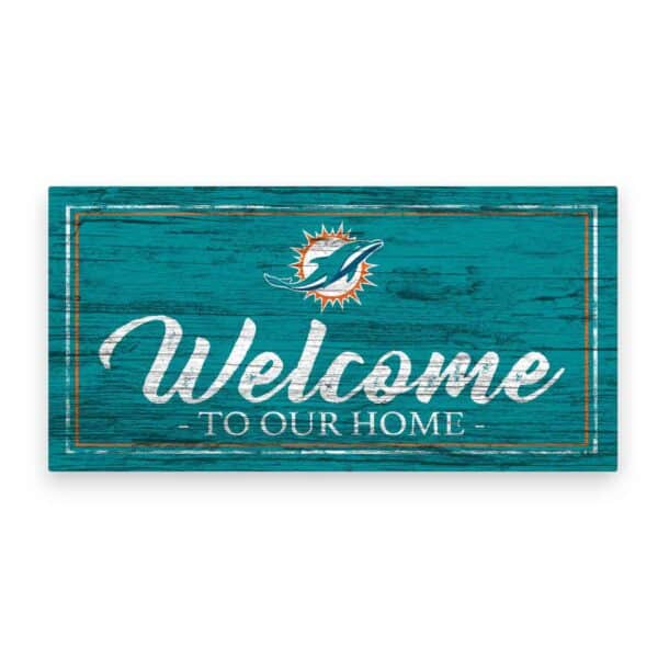 Show your spirit with this officially licensed NFL Miami Dolphins Home Sign! Our Miami Dolphins Home Sign is decorated with the team logo, colors, and the text “Welcome to our Home”. It is a distressed design to mimic the look of rustic wood. The image is printed directly onto MDF wood and includes an attached twine hanger. This football sign is made in the USA and measures 12″ x 6″. The sports sign can be used as a wreath accent sign, home decor, party decor or a gift for that special football fan.FAQs