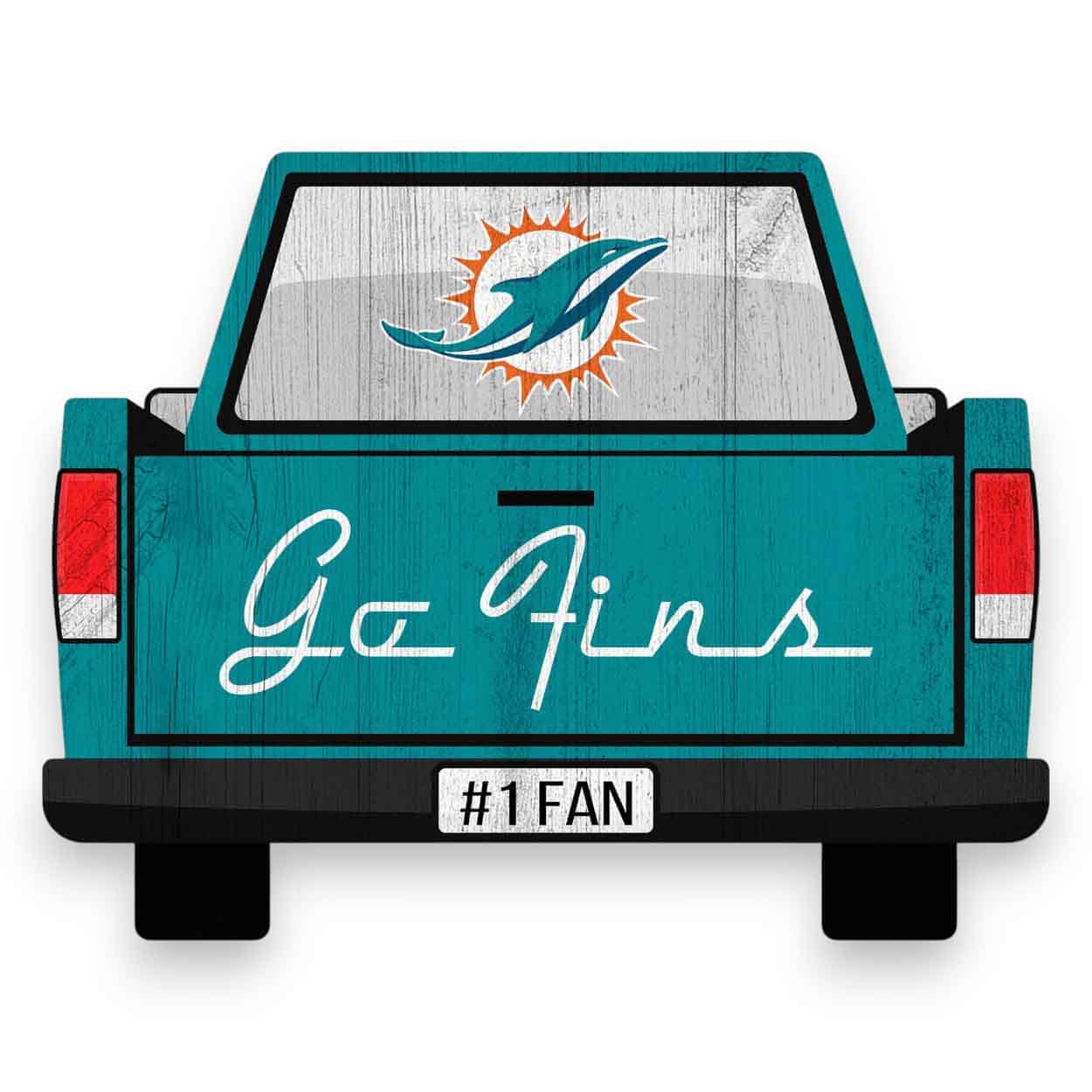 Show your spirit with this officially licensed NFL Miami Dolphins Tailgate Sign! Our sign is decorated to look like the back end of a sporty pickup truck. The football sign is decorated with team logo, colors and slogan. This is a distressed design to mimic the look of rustic wood and measures 12″ x 9.5″ x .25″. The sign base is MDF wood and made in the USA. The design is printed directly onto the wood (this is not an adhesive sticker) and includes a sawtooth hanger. This Miami Dolphins Tailgate Sign is perfect as a wreath accent sign, sports craft supply, home decor, party decor, or a gift for that special football fan.FAQs
