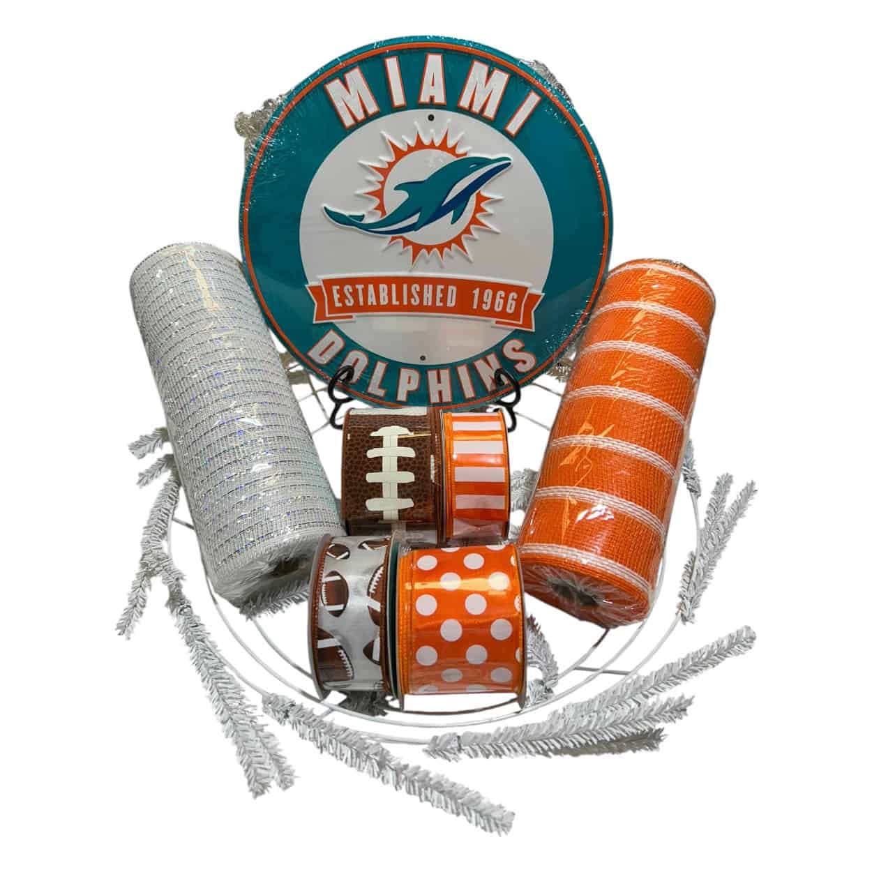 Show your team spirit with our Miami Dolphins Wreath Kit. This coordinated wreath kit includes matching ribbon, deco mesh, a wire wreath frame, and a Miami Dolphins sign to help you create a bold 24″ team-themed wreath without the guesswork. The bundle contents are fixed and pre-packed for convenience, value, and faster shipping.