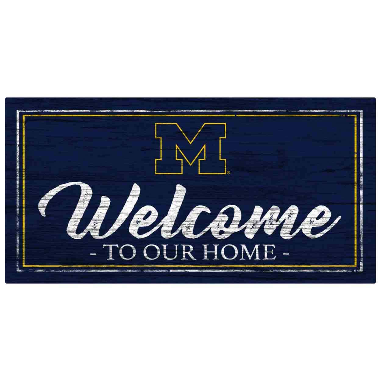 Show your spirit with this officially licensed NCAA Michigan Home Sign! Our sign is decorated with the school colors and logo, along with the text “Welcome to our Home”. It is a distressed design to mimic the look of rustic wood. The sign image is printed directly onto MDF wood and includes an attached hanger. This Michigan Home Sign is made in the USA and measures 12″ x 6″ x .25″. The welcome sign can be used as a wreath accent sign, home decor or a gift for that special fan.FAQs