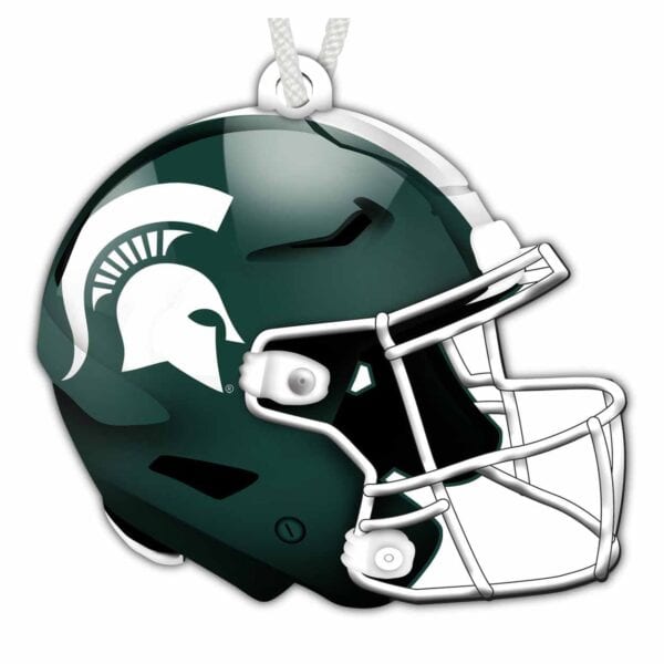 Show your spirit with this officially licensed NCAA Michigan State Flat Helmet Ornament! The football ornament is in the shape of a helmet and decorated with the school logo and colors. This is a distressed design to mimic the look of rustic wood. The design is printed directly on MDF wood on the front side only, while the back side is bare wood. This Michigan State Flat Helmet Ornament is made in the USA and measures 4″ x 4″ x .25″. It’s perfect as a wreath accent sign, sports craft supply, gift tag, tree ornament or a gift for that special football fan.FAQs