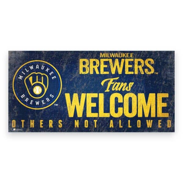 Show your spirit with this officially licensed MLB Brewers Fans Welcome Sign! Our sign is decorated with the team name, logo, colors and text “Fans Welcome, Others Not Allowed”. It is a distressed design to mimic the look of rustic wood. The image is printed directly on the sign base, made of MDF wood – this is not a printed paper decal. This sign is made in the USA and measures 12″ x 6″ x .25″ and includes an attached rope hanger. The Brewers Fans Welcome Sign can be used as a wreath accent sign, home decor or a gift for that special fan.FAQs