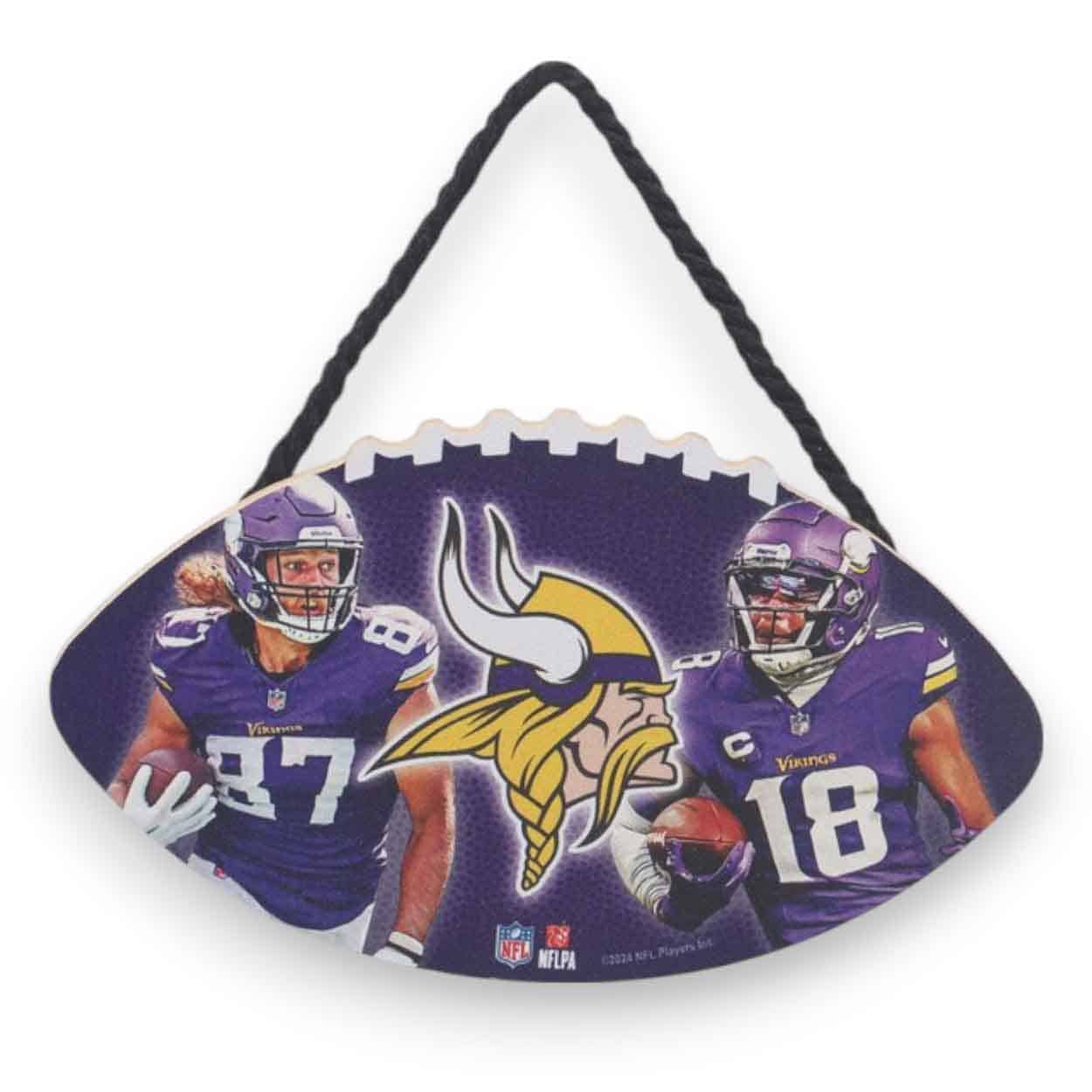 Cheer on your team with our Minnesota Vikings Players Ornament! This officially licensed NFL ornament features the team logo, colors and two of your favorite players. The ornament is also officially licensed by the NFLPA. The Christmas ornament measures 5.625″ W X 3.75″ H X 0.25″ D and is made in the USA. It is made of wood and features an attached black hanger. The ornament is in the shape of a football and is die cut at the top laces. The design shown in on the front of the ornament, while the sides and back are plain wood. This Minnesota Vikings Players Ornament is perfect for wreaths, Christmas trees, home decor and gifts for that special NFL Vikings football fan.FAQs