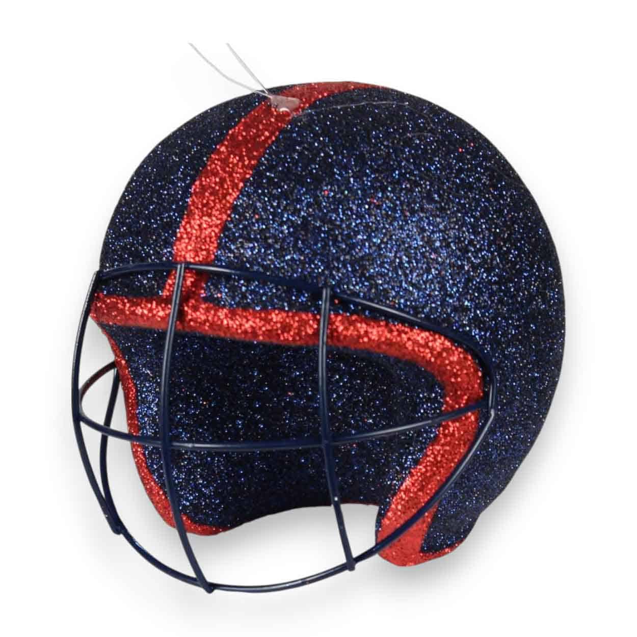 Add bold sparkle with the Navy Red 3D Football Helmet Ornament, a festive accent made of glitter-covered plastic in a navy-and-red color scheme. Measuring 4″ diameter, it includes an attached clear plastic loop for easy hanging on wreaths, trees, garlands, and gift packages. A fun finishing touch for football décor, party decorating, crafts, tree trimming, and fan gifting.