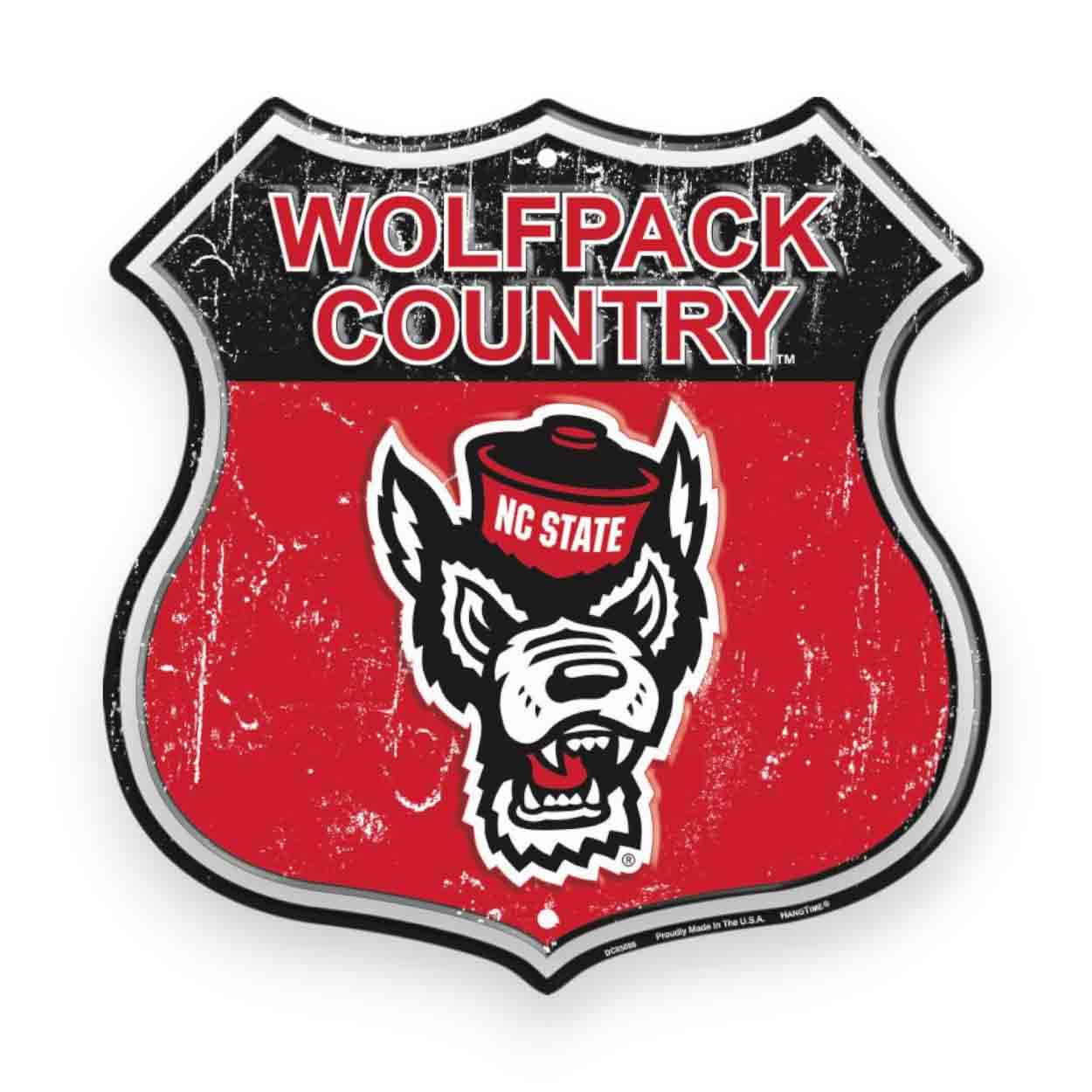 Show your spirit with our NC State Shield Sign! This officially licensed NCAA NC State Shield Sign features the team colors and logo on a shaped sign. The image is a distressed design. The lightweight weather resistant embossed aluminum sign measures 12 inches wide x 12 inches tall. It includes predrilled holes at 6 and 12 o’clock for easy mounting. This collegiate sign is made in the USA and perfect for wreaths, home decor, party decor and fan gifts!FAQs