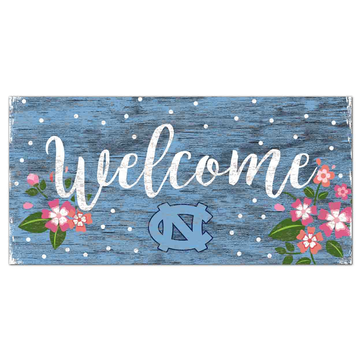 Show your spirit with this officially licensed NCAA NC Tar Heels Flowers Sign! Our sign is decorated with the school logo and colors, along with the script text “Welcome”. This beautiful sign is decorated with color-coordinating flowers and white polka dots. It is a distressed design to mimic the look of rustic wood. The image is printed directly onto MDF wood and the sign includes an attached twine hanger. This NC Tar Heels Flowers Sign is made in the USA and measures 12″ x 6″ x .25″. The sign can be used as a wreath accent sign, home decor or a gift for that special fan.