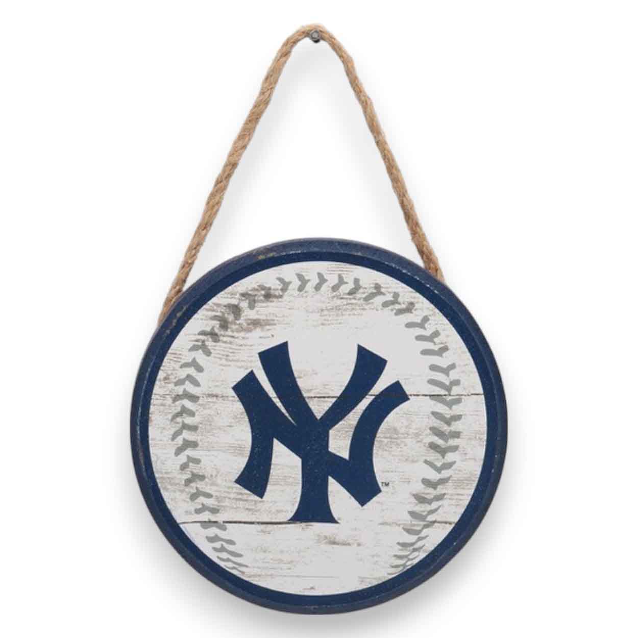 Cheer on your team with our NY Yankees Ornament! This officially licensed MLB ornament features the team logo and colors in a distressed design. The Christmas ornament measures 4″ W X 4″ H X 0.375″ D and is made in the USA. It is made of wood and features an attached twine hanger. The design shown in on the front of the ornament, while the back of the ornament is plain wood. This NY Yankees Baseball Ornament is perfect for wreaths, Christmas trees, home decor and gifts for that special MLB Yankees fan.FAQs