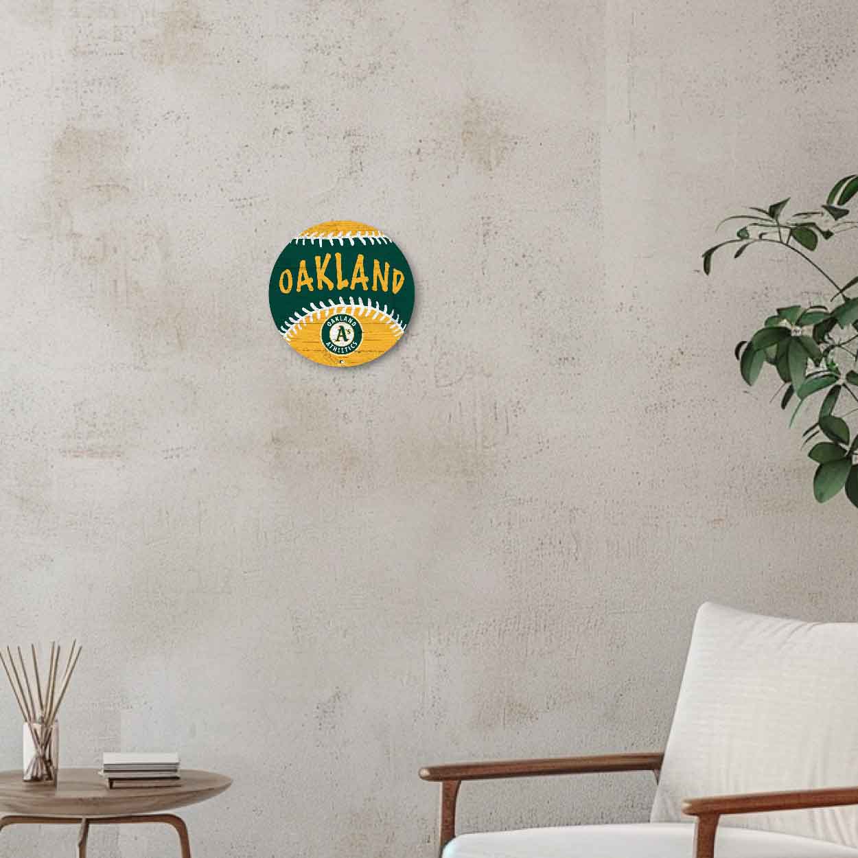Our Oakland Athletics Baseball Sign features a baseball decorated with the team colors, name and logo. This officially licensed MLB Oakland Athletics Baseball Sign measures 12″ diameter and is .25 inches thick. This is a distressed design and the images are printed directly onto MDF wood. The sign is made in the USA and includes an attached saw-tooth hanger. The sign can be used as a wreath sign, home decor, party decor or a gift for that special baseball fan.FAQs