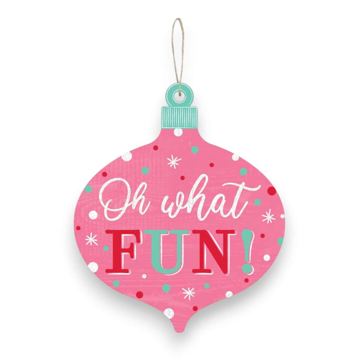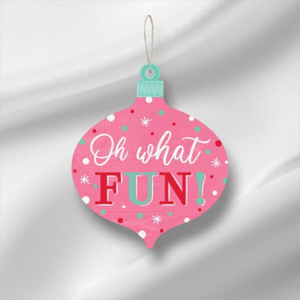 Our Oh What Fun Christmas Sign is just adorable! The sign features the text “Oh What Fun” on a pink background in the shape of a Christmas ornament. This sign measures 12″ x 10″ x .25″, is made of printed paper on MDF wood and includes an attached twine hanger. Perfect for a Christmas wreaths, home decor and Winter decorations.