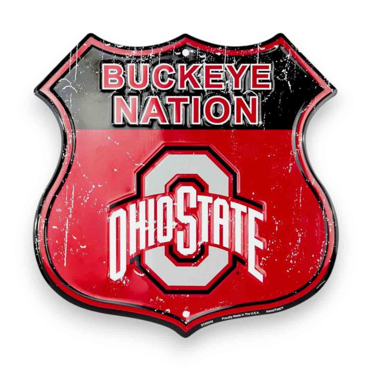 Show your spirit with our Ohio Buckeyes Shield Sign! This officially licensed NCAA Ohio Buckeyes Shield Sign features the team colors and logo on a shaped sign. The image is a distressed design. The lightweight weather resistant embossed aluminum sign measures 12 inches wide x 12 inches tall. It includes predrilled holes at 6 and 12 o’clock for easy mounting. This collegiate sign is made in the USA and perfect for wreaths, home decor, party decor and fan gifts!FAQs
