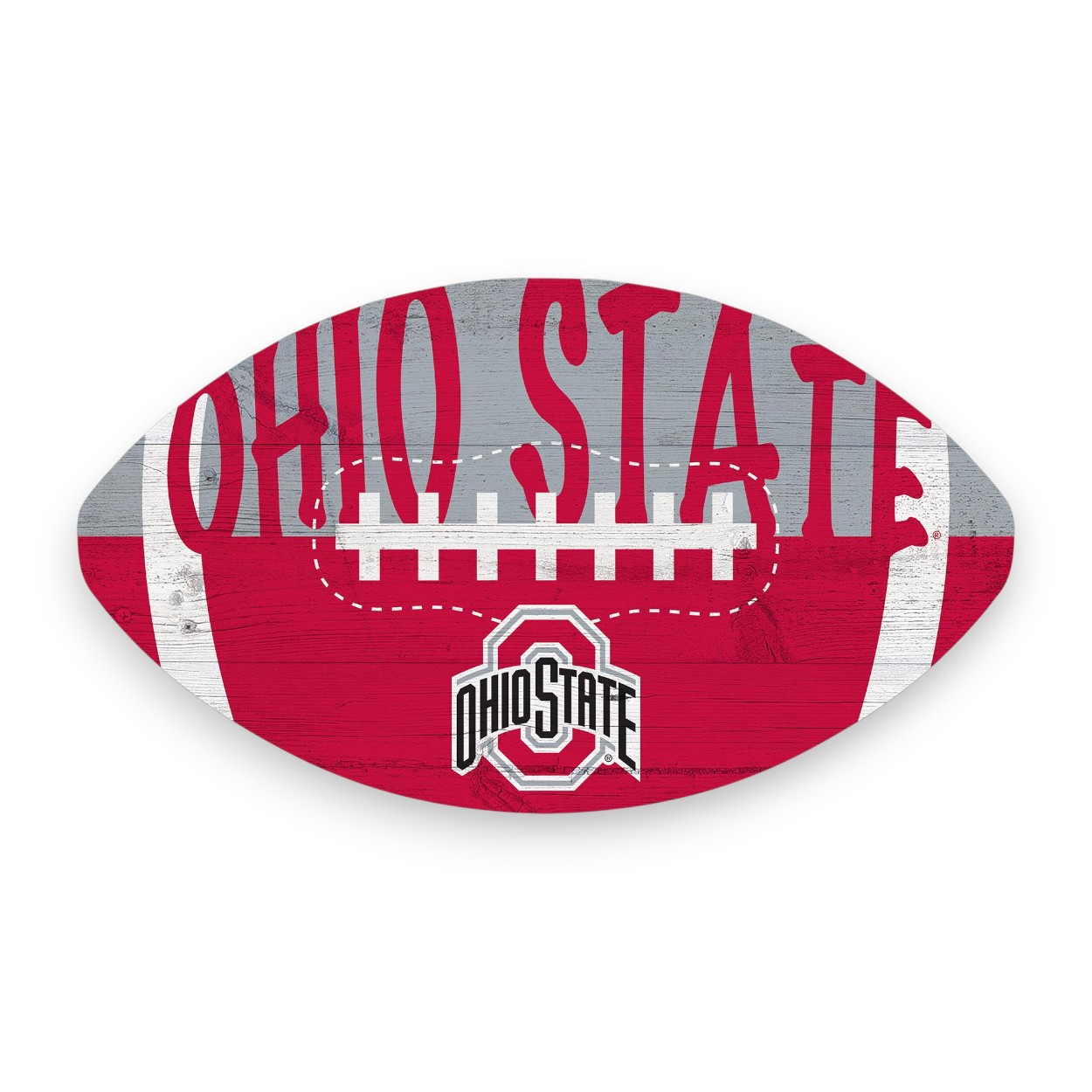 Celebrate game day with this officially licensed NCAA Ohio State Color Football Sign, featuring a football design in the The Ohio State University logo and team colors. The rustic distressed finish gives it a weathered wood look, and the image is printed directly on durable MDF. Made in the USA, this Ohio State Color Football Sign measures 12″ x 7″ x 0.25″. Use it as a wreath accent sign, front door or wall decor, tailgate decor, or a fun gift for any Buckeyes fan.