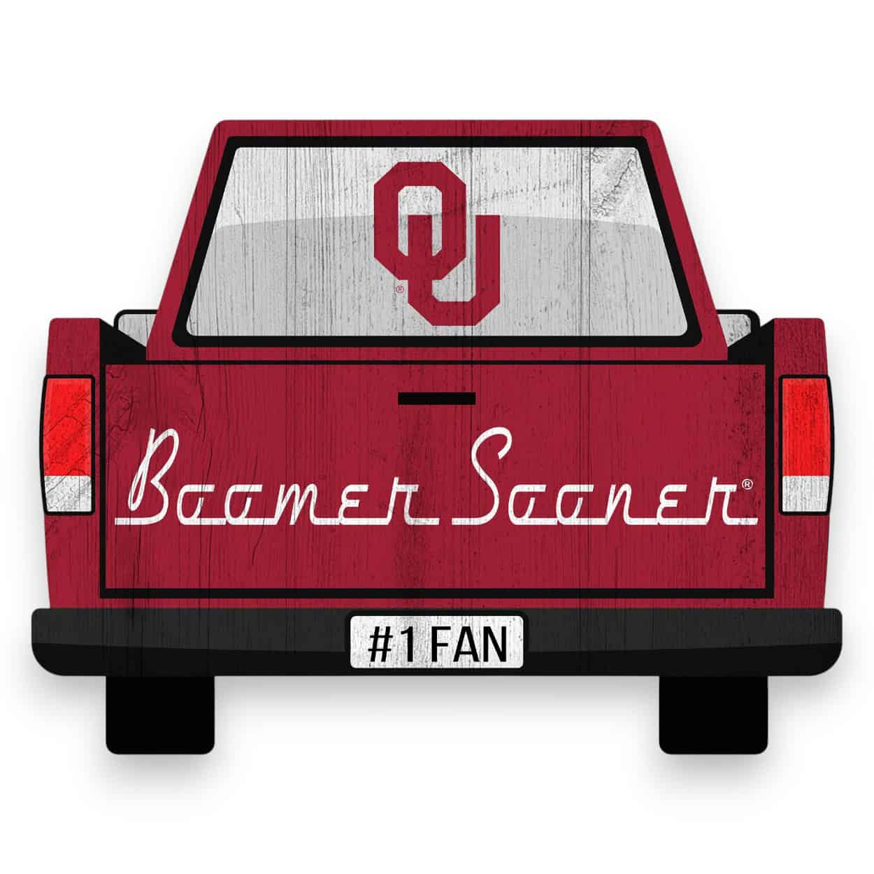 Show your spirit with this officially licensed NCAA Oklahoma Sooners Tailgate Sign! Our Oklahoma Sooners Tailgate Sign is decorated to look like the back end of a sporty pickup truck. The back window is decorated with the school logo, the tailgate with the school text and the license plate with #1 Fan. This is a distressed design to mimic the look of rustic wood and measures 12″ x 9.5″ x .25″. The sign base is MDF wood and made in the USA. The design is printed directly onto the wood (this is not an adhesive sticker) and includes a sawtooth hanger. Perfect as a wreath accent sign, sports craft supply, home decor, or a gift for that special football fan.