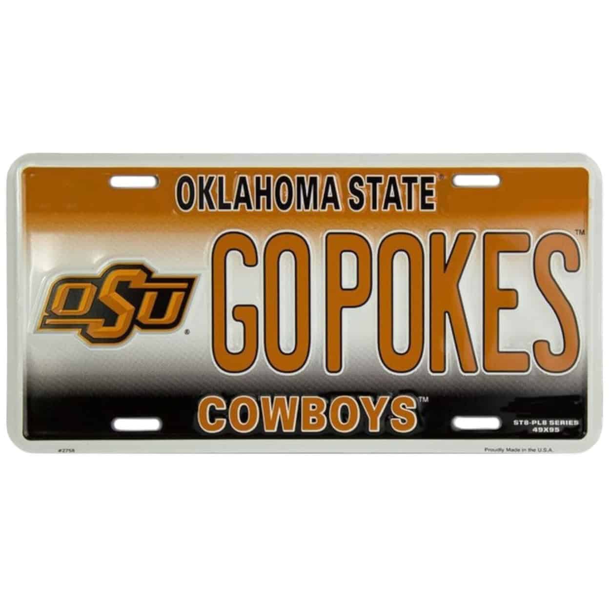 Our Oklahoma State Pokes License Plate is perfect for your football wreaths, home decor, vehicles and gifts! This Oklahoma State Pokes License Plate measures 12″ wide x 6.75″ tall and is made of weather resistant embossed aluminum. It includes 4 pre-drilled holes for easy mounting. This sign is made in the USA and is an officially licensed product. This license plate makes a great gift for that OSU fan!