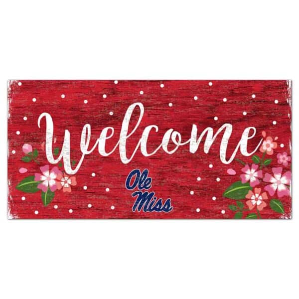 Show your spirit with this officially licensed NCAA Ole Miss Flowers Sign! Our sign is decorated with the school logo and colors, along with the script text “Welcome”. This beautiful sign is decorated with color-coordinating flowers and white polka dots. It is a distressed design to mimic the look of rustic wood. The image is printed directly onto MDF wood and the sign includes an attached twine hanger. This Ole Miss Flowers Sign is made in the USA and measures 12″ x 6″ x .25″. The sign can be used as a wreath accent sign, home decor or a gift for that special fan.