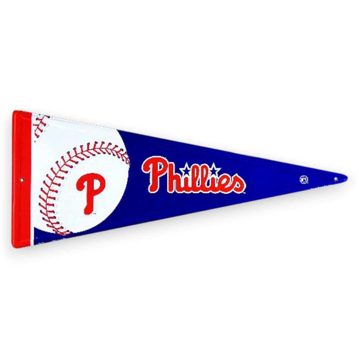 Our Phillies Pennant Sign is perfect for your wreaths, home decor and gifts! This metal sign measures 22″ wide x 9″ tall and is made of weather resistant embossed aluminum. It includes 2 pre-drilled holes for easy mounting. This sign is made in the USA and is an officially licensed product. The sign makes a great gift for that Phillies fan!