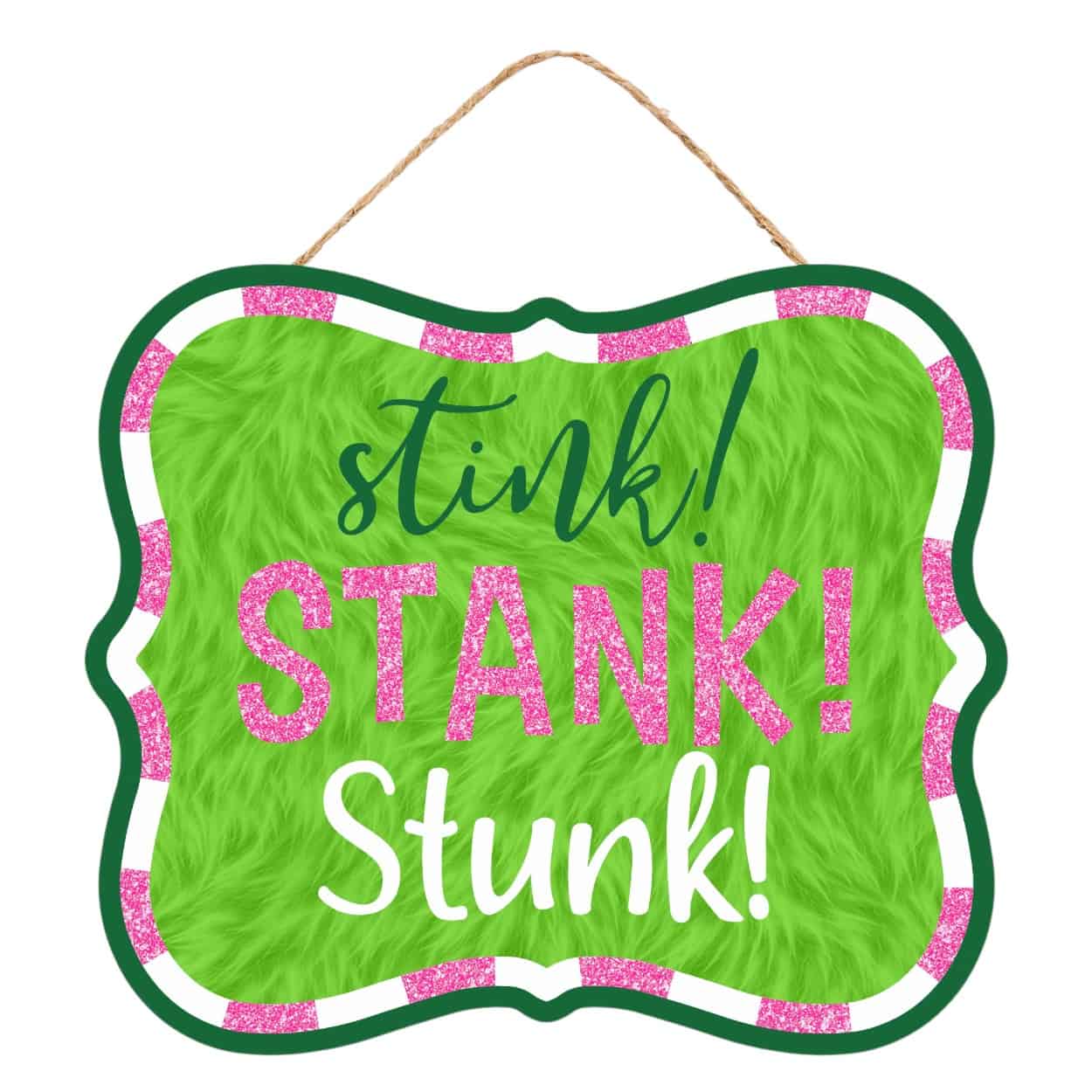 Our Pink Stink Stank Stunk Sign features the text “Stink! Stank! Stunk!” on a green background. Areas of the sign in pink have glitter. This Christmas sign is made of printed paper on mdf, includes an attached twine hanger and measures 10.5″ x 9″ x .25″. Perfect for a Christmas Grinch wreath, party decoration or gift for that special green monster lover.
