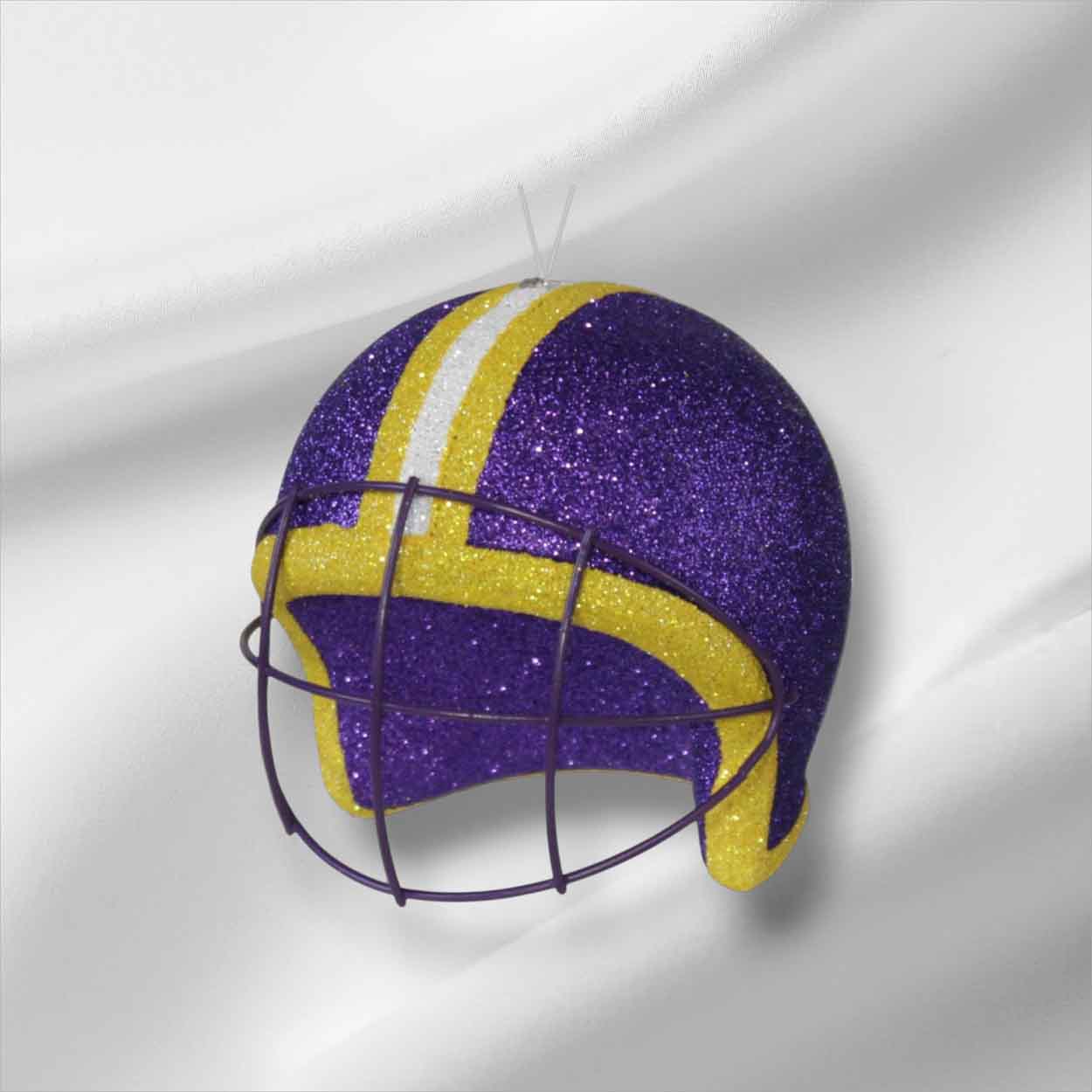 Our Purple Yellow 3D Football Helmet Ornament features a colored helmet with an attached clear plastic loop for hanging. The 3D football helmet measures 4″ diameter and is made of plastic covered in glitter. It also has a metal face mask. This ornament is perfect for a football wreath, craft project, party decorations, tree trimming gifts and more!FAQs