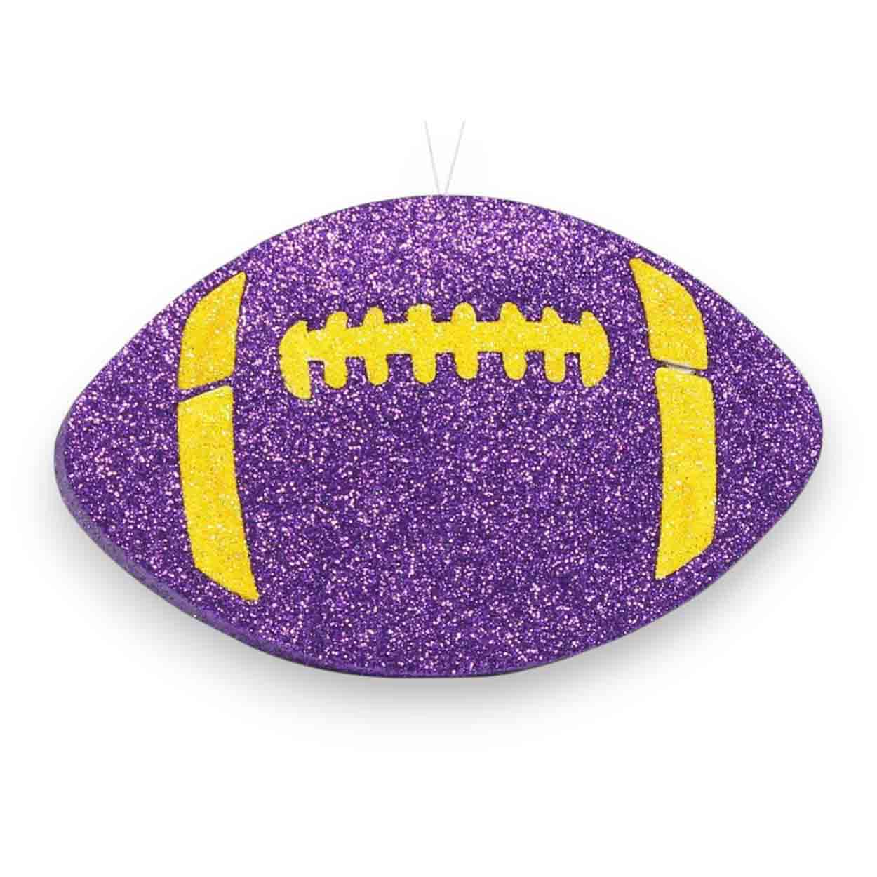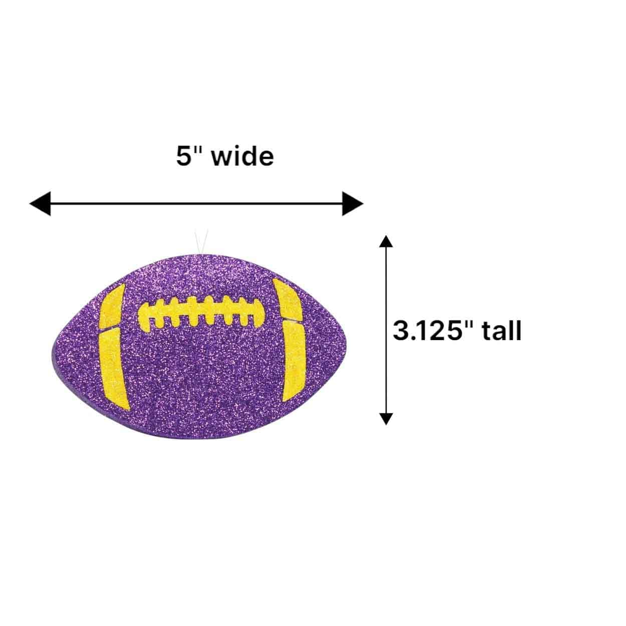 Our Purple Yellow Flat Football Ornament is wonderful for all sorts of crafts, especially wreath making! This purple yellow Football Ornament measures 5″ long x 3.25″ tall x 5/8″ thick. The foam base is covered in purple and yellow metallic glitter and includes a clear loop hanger for hanging. The design is on the front side only. This Purple Yellow Flat Football Ornament is ***NOT 3D**. It is flat. It’s perfect for wreaths, craft projects, your Christmas tree, gift tags or as a gift for that special football fan.FAQs