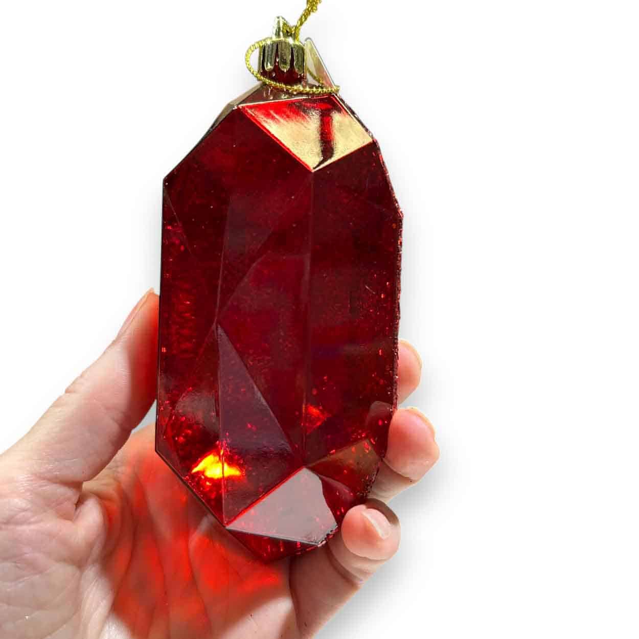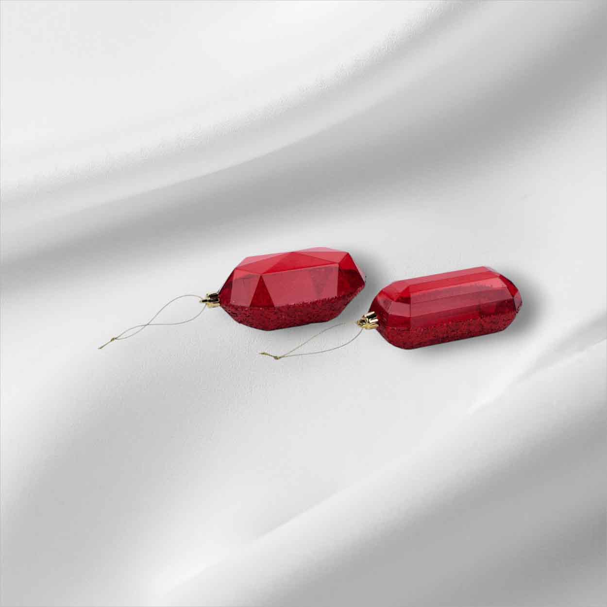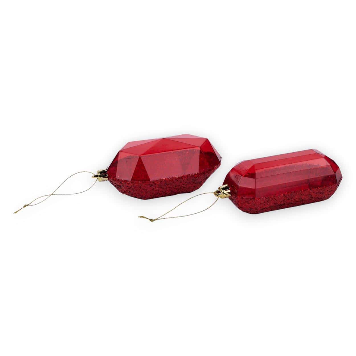 Add instant sparkle with these Red Gem Ornaments, a set of two lightweight plastic gems with a laser glitter backing for extra shine. The set includes one oval gem measuring 5.25″ tall x 2.5″ wide x 2.5″ deep and one rectangle gem measuring 5.25″ tall x 2.5″ wide x 2″ deep. Perfect for wreath making, Christmas trees, party décor, and blingy craft projects.