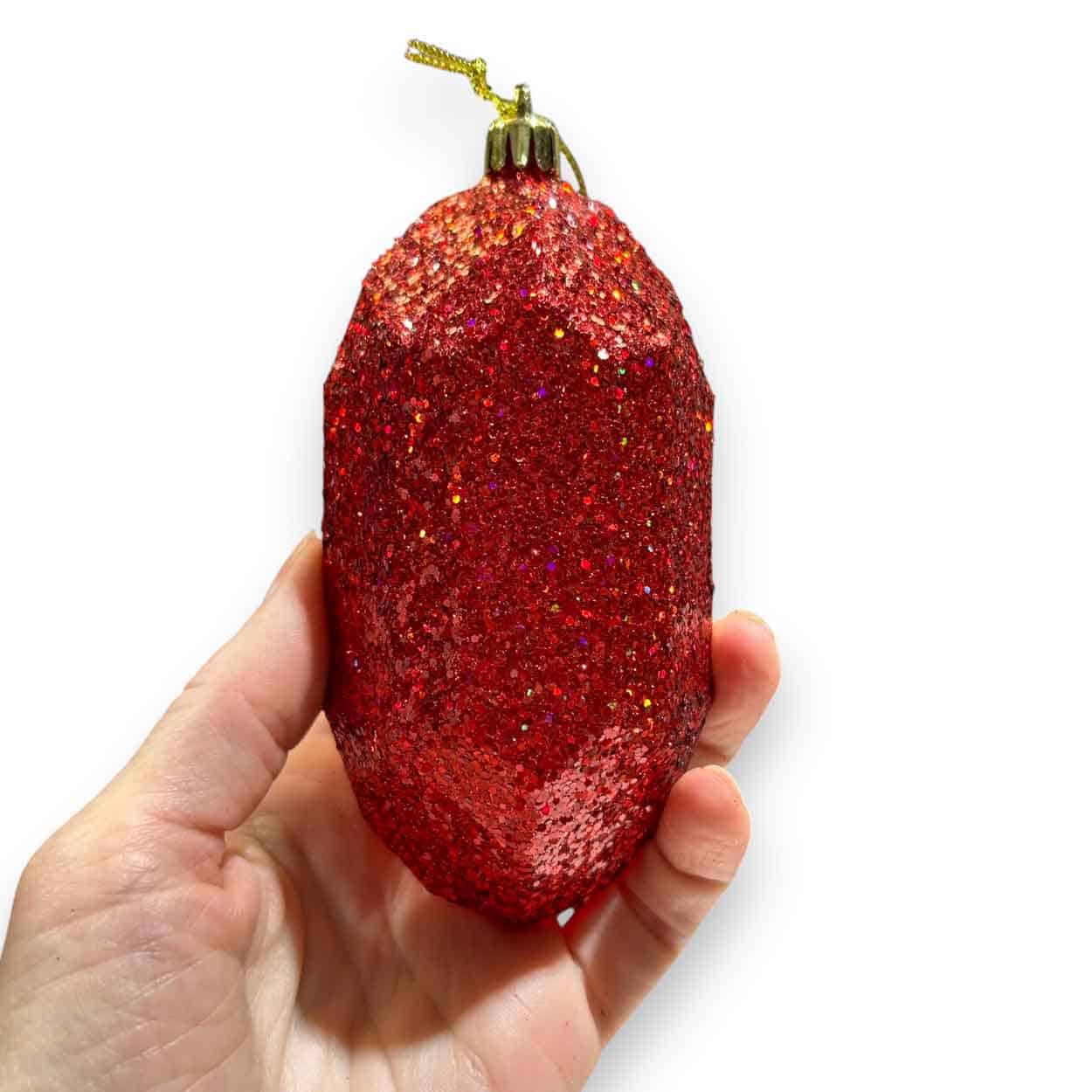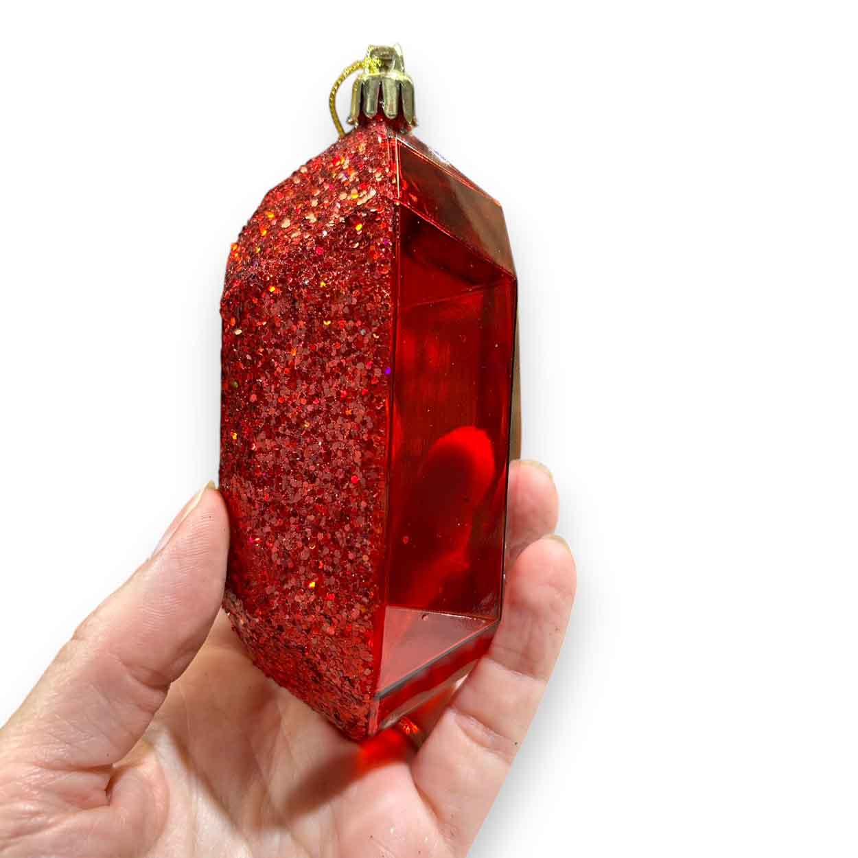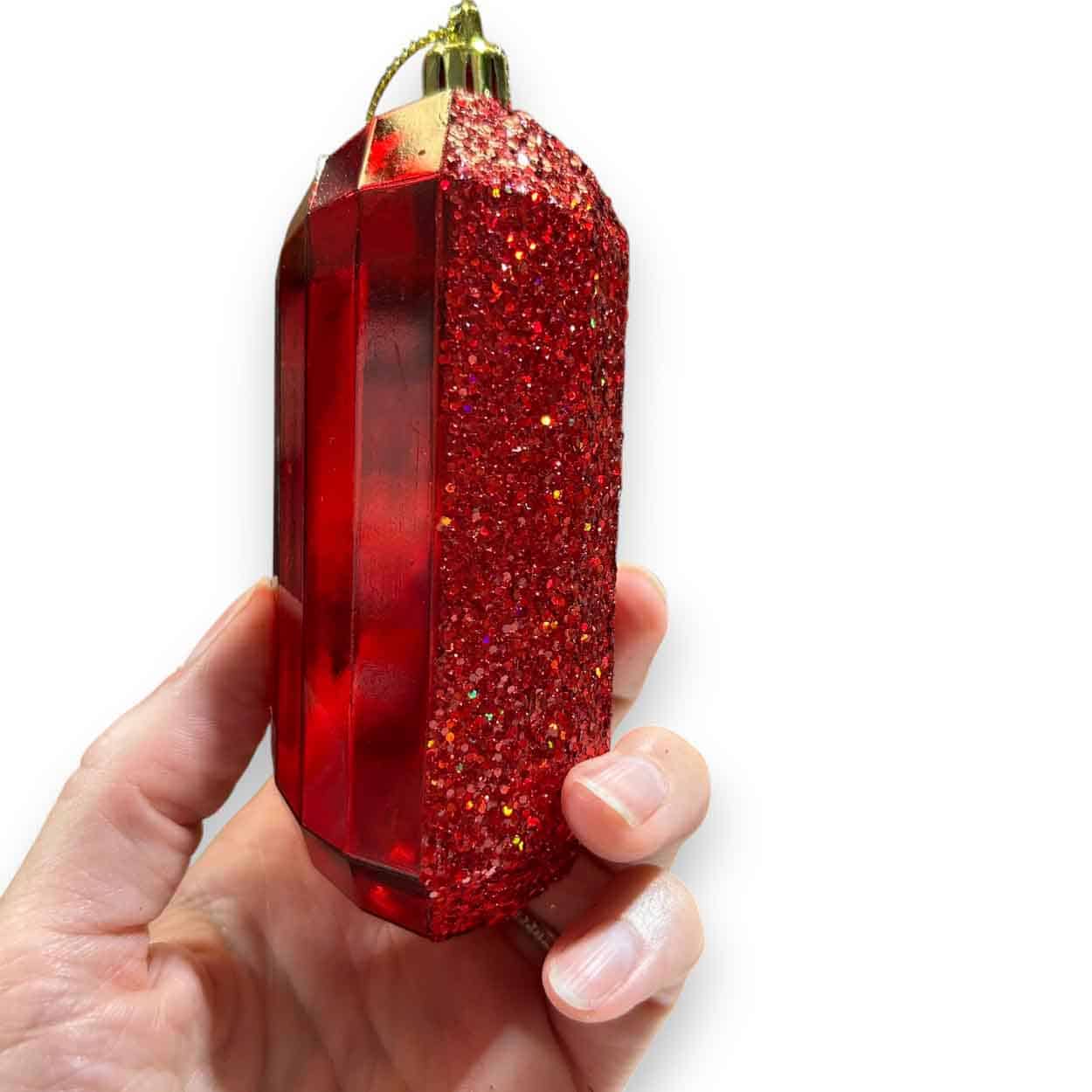 Add instant sparkle with these Red Gem Ornaments, a set of two lightweight plastic gems with a laser glitter backing for extra shine. The set includes one oval gem measuring 5.25″ tall x 2.5″ wide x 2.5″ deep and one rectangle gem measuring 5.25″ tall x 2.5″ wide x 2″ deep. Perfect for wreath making, Christmas trees, party décor, and blingy craft projects.