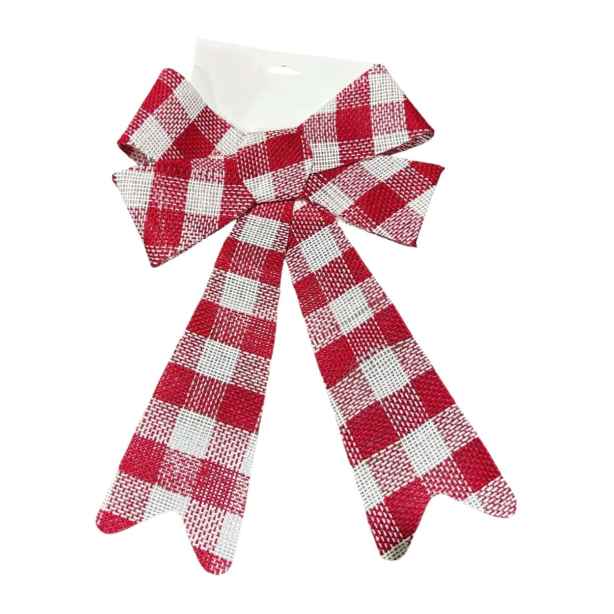 Add a classic pop of pattern with Red White Check Bow—a ready-to-use bow made with red and white check woven fabric over an acrylic bow frame. Measuring 9.5 inch wide x 14 inch tall, this Red White Check Bow includes a gold twister hanger for quick attachment to wreaths, trees, gifts, and crafts. Use this bow as the perfect finishing touch for holiday and everyday decorating.